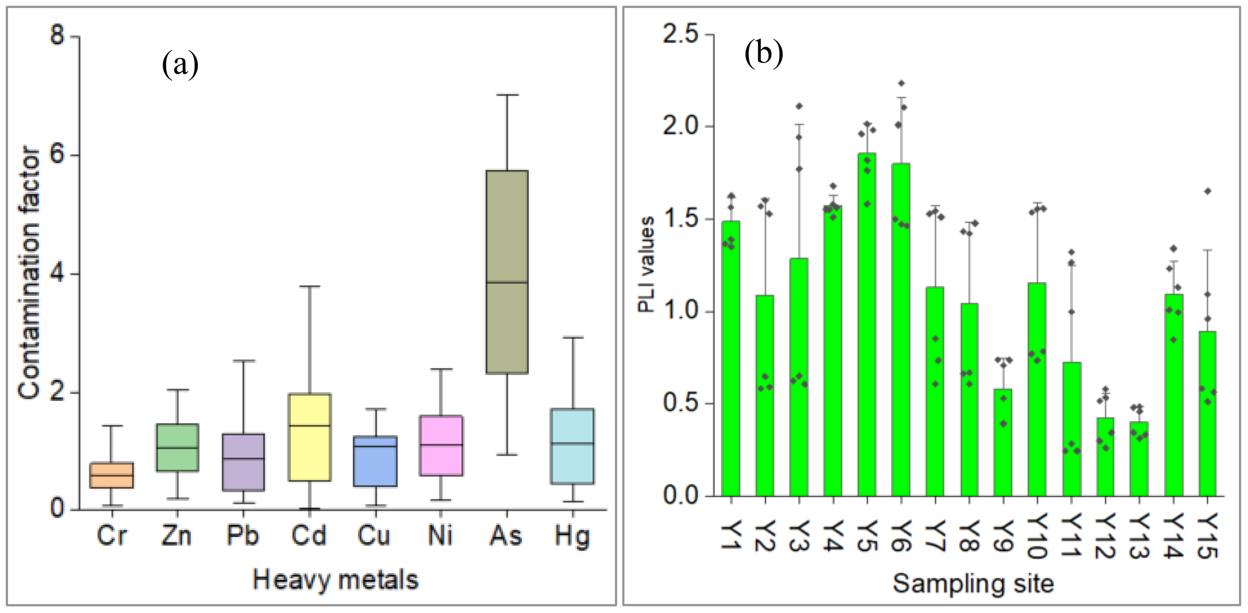 (a) Contamination factor (CF) and (b) Pollution load index (PLI) of the metals.