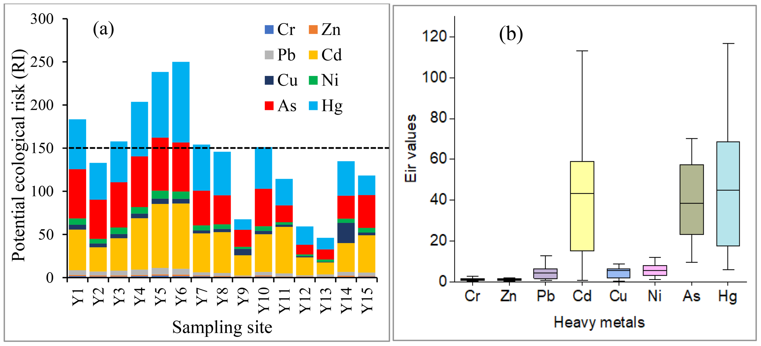 (a) Potential ecological risk index (RI) and (b) risk factors for sediment heavy metals in Xiaohai lagoon.