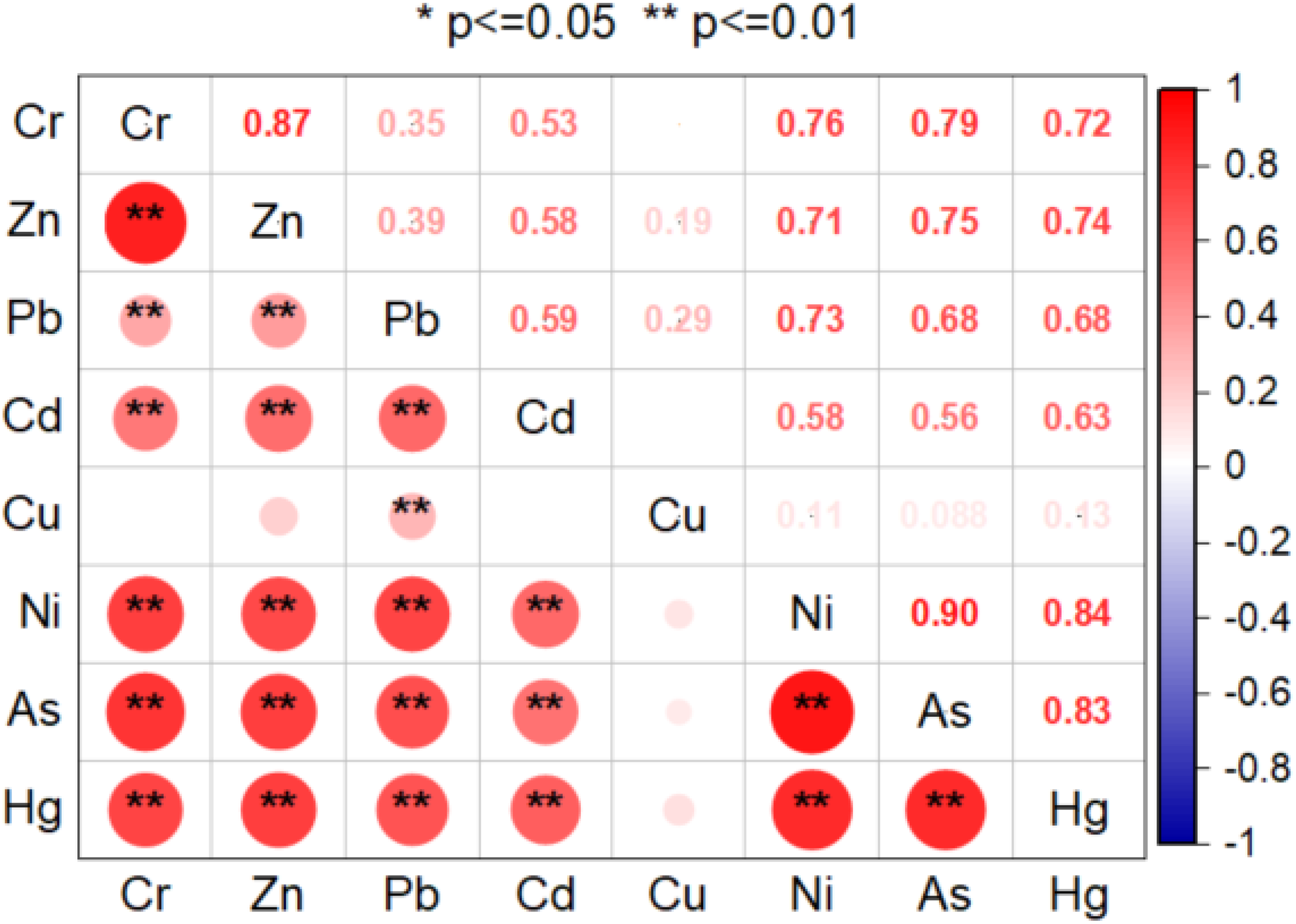 The complex origins of Xiaohai Lagoon’s heavy metals reflect synergistic inputs from both human activities and natural processes. Urban runoff and untreated domestic sewage, common in densely populated watersheds, are primary vectors for Zn, Pb, and Cu, as these metals leach from corroding pipes, roofing materials, and vehicular residues (Kodat and Tepe, 2023). Conversely, Cd and As correlate strongly with agricultural practices as discussed earlier, likely originating from phosphate fertilizers and legacy pesticides that accumulate in fine-grained sediments during monsoon-driven runoff (Bhuyan et al., 2023; Fuentes-Gandara et al., 2021). However, emerging research highlights the interplay of natural and anthropogenic sources for metals like Cu, Cr, Pb, and Zn. For instance, Cu and Zn in Xiaohai may derive from both shipyard discharges (e.g., antifouling paints) and natural weathering of bedrock minerals in the lagoon (Dinis et al., 2021; Jahromi et al., 2021). The significant Pb-Cu correlation (r = 0.7, p < 0.01) further underscores multifaceted contamination pathways. While Pb is related to fossil fuel combustion and battery waste, its linkage to Cu, a metal abundant in electrical wiring and marine coatings, suggests overlapping urban-industrial sources, such as dismantling fishing vessels or informal e-waste recycling along the shoreline. This duality complicates remediation efforts, as disentangling natural geogenic contributions (e.g., Cu from regional sulfide deposits) from anthropogenic inputs requires isotopic fingerprinting or spatial sediment profiling. Notably, the weak positive correlation was possibly due to complex interactions among multiple variables. However, the shared source indicates that they might have originated from overlapping anthropogenic activities or geochemical processes.