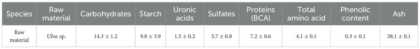 Table 1 provides details of the biochemical composition of Ulva sp. raw material, including total sugars and starch, proteins, ash, uronic acids, sulfate groups and total phenolic content expressed as percentage of dry weight (% d.w.). Cultivated Ulva sp. raw material is mainly composed of mineral matter that in the present study accounts for 38.1 ± 0.1% d.w. Sugar and starch are the second most frequent components found in Ulva sp. accounting for, respectively, 14.3 ± 1.2% d.w. and 9.8 ± 3.9% d.w. Sulfate groups and uronic acids account for, respectively, 5.7 ± 0.8% d.w. and 1.5 ± 0.2% d.w. Ulva sp. raw material has a low phenolic content (0.3 ± 0.1% d.w.) and its monosaccharide contents are mainly glucose (6.20 ± 0.3% d.w.), rhamnose (3.60 ± 0.2% d.w.), glucuronic acid (3.2 ± 0.2% d.w.), xylose (0.35 ± 0.02%d.w.) and ribose (0.23 ± 0.0% d.w.).