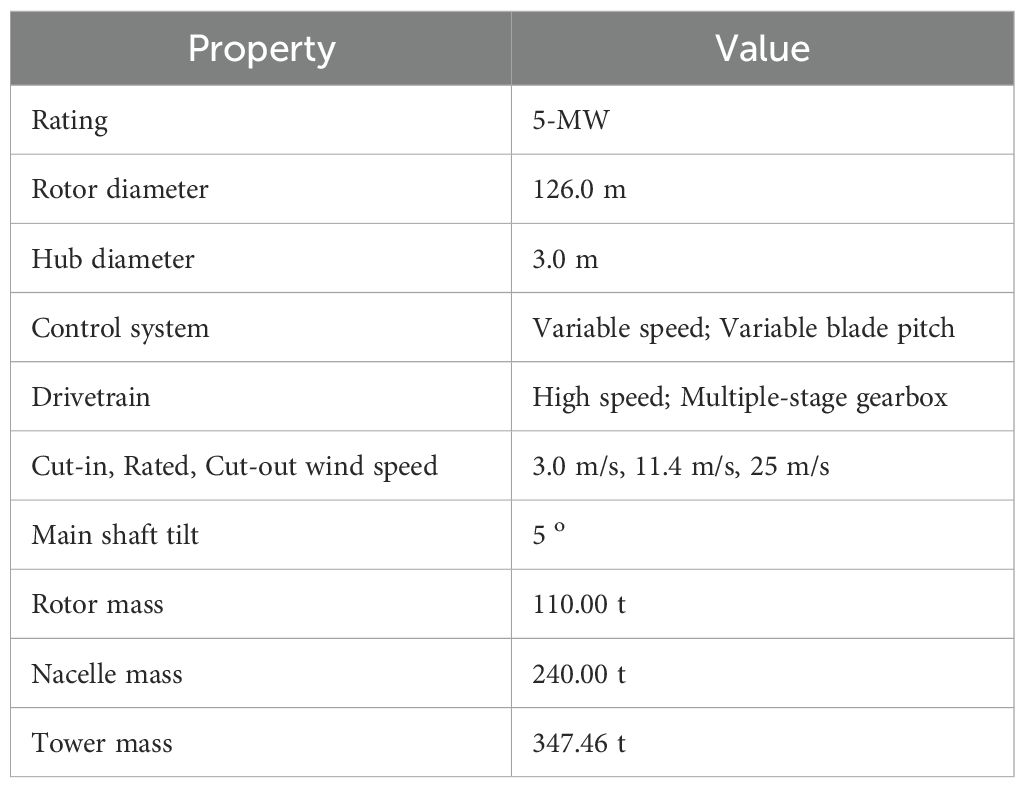 As shown in Figure 2, the OC3 Hywind FOWT comprises a deep-draft spar platform and a 5MW baseline wind turbine developed by NREL. The 5 MW wind turbine employs a standard configuration with collective variable-speed and variable blade-pitch-to-feather (Jonkman et al., 2009); its main parameters are detailed in Table 1.