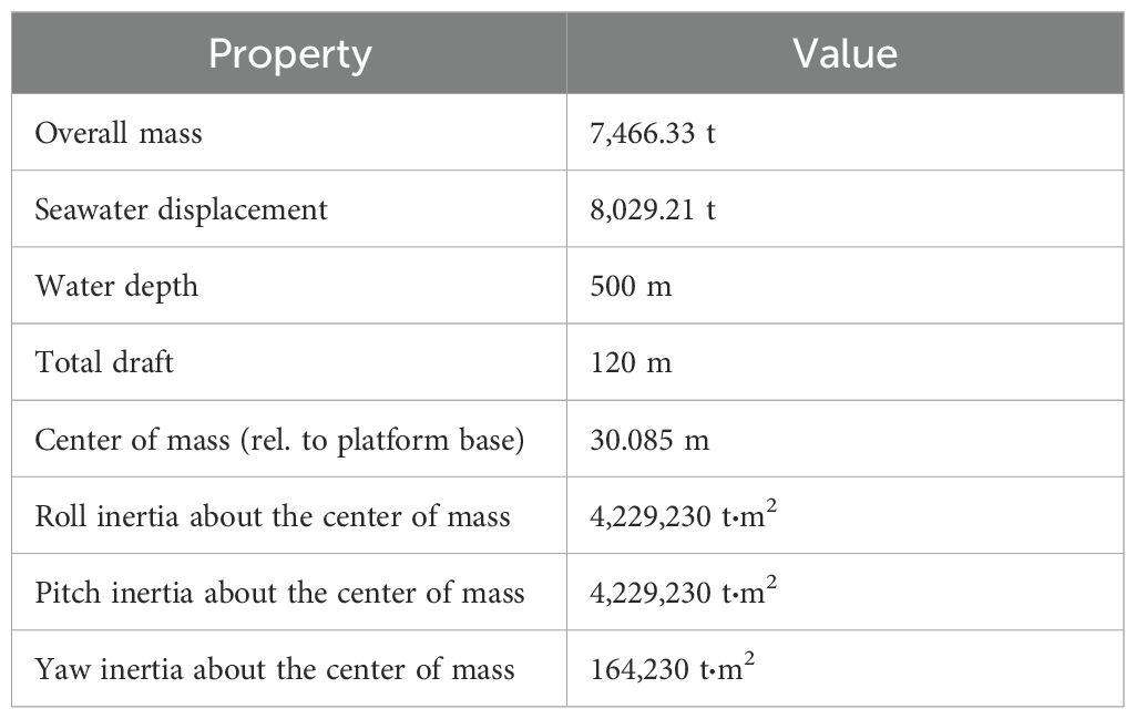 The spar platform is made up of upper and lower cylindrical segments connected together by a conical segment (Jonkman, 2010). The platform parameters are listed in Table 2. The mooring system consists of three catenary mooring lines, spaced 120° apart.