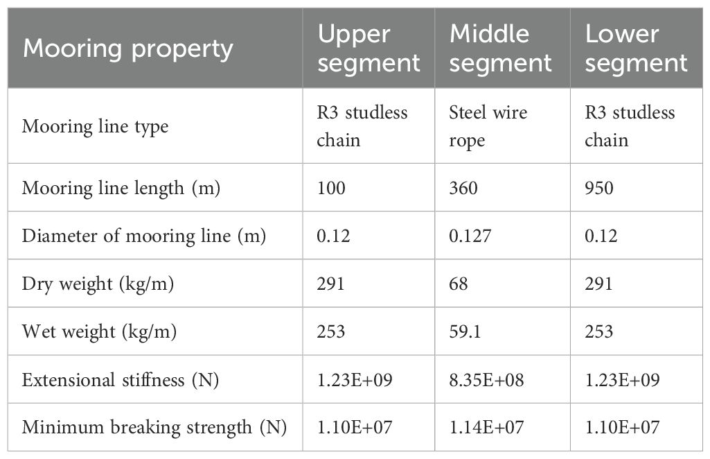 A mooring system, which is designed to hold a floating platform in position and provide sufficient restoring force under various environmental conditions (Huang et al., 2024). Based on the water depth, mooring specifications, and the restoring stiffness of the platform, a quasi-static design was conducted for a single mooring line in this study. As illustrated in Figure 1, this study utilizes a chain-wire-chain configuration for the single mooring line. Each FOWT has two single anchor mooring lines at the sides with a 120° angle between them.