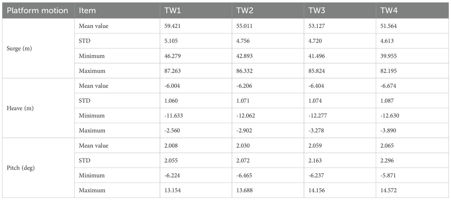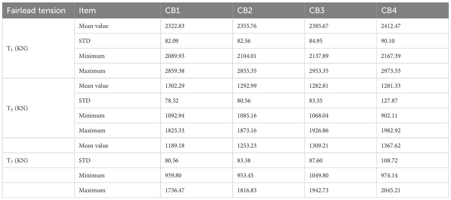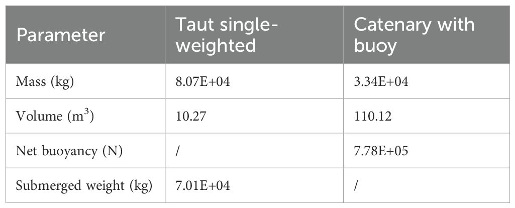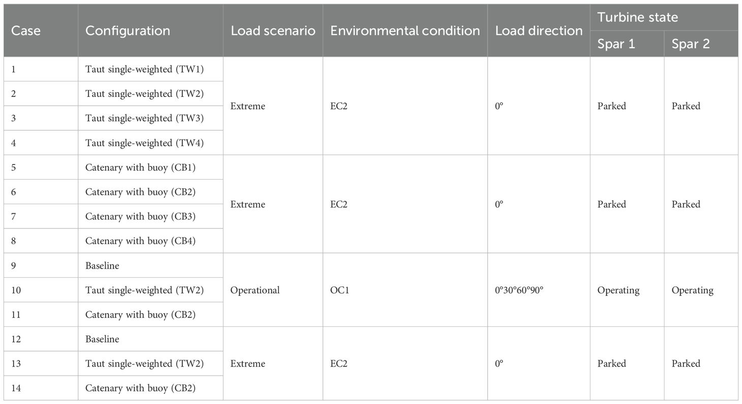 To study the overall dynamic response of FOWF under wind-wave-current combined loads, time-domain numerical simulations are performed in OrcaFlex. Liang et al. (2024b) conducted a convergence analysis of the shared mooring system under extreme conditions, investigating the sample averages of platform motion and mooring response statistics. The results showed that 15 simulations, each lasting 1 hour, were sufficient for the dynamic response statistics to converge. Therefore, after excluding the initial transient period, fifteen 1-hour simulations were conducted for each case using different random seeds. The random seeds adopted correspond to the default seeds 1–15 in OrcaFlex. A time step of 0.1 s was chosen to ensure accurate capture of the system’s dynamic characteristics (Liu et al., 2024). As shown in Table 7, Cases 1–4 are used to analyze the impact of submerged weight of the clump weight, Cases 5–8 are for assessing the effect of net buoyancy of the buoy, and Cases 9–14 are used to compare the performance of the three shared mooring systems. In addition, based on the simulation results of Cases 1-8, an analysis was conducted on the material costs of shared mooring. The specific analysis results are presented in Sections 4, 5, and 6, respectively.