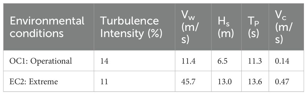 In the operational condition, the rated wind speed of the FOWT corresponds to the mean wind speed (Vw), while the significant wave height (Hs), peak spectral period (TP), and mean current speed (Vc) are derived from the mean values of their conditional distributions. The extreme condition is derived from the 50-year return period environmental contour. Following standard practice (DNV, 2015), the sea state associated with the highest Hs value along this contour is designated as the extreme event for analysis. The wave spectrum is modeled using the JONSWAP spectrum, while the wind spectrum follows the Kaimal spectrum. Specific parameters for both operational and extreme conditions are provided in Table 6. For mooring system analysis, the simulation is usually carried out under the worst sea states, and the wind, wave and current acting in the same direction (DNV, 2010). The direction of environmental loads is illustrated in Figure 6.