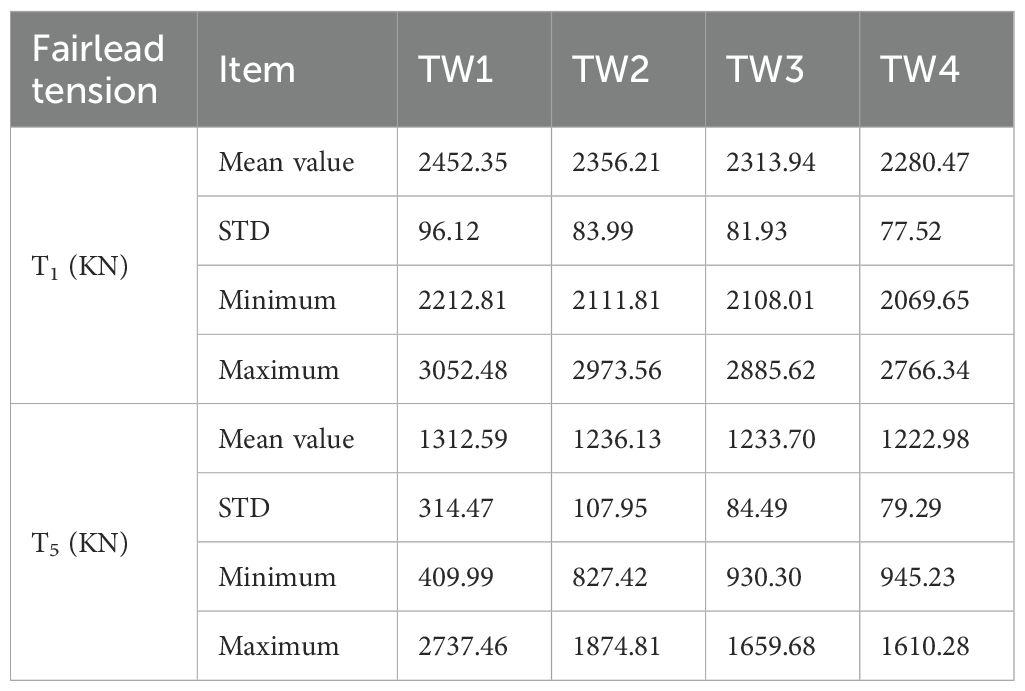 For the taut single-weighted configuration, the polyester rope length and corresponding clump weight parameters were selected according to Table 8, and time-domain simulations were conducted under the extreme scenario. The results will be discussed in the following sections.