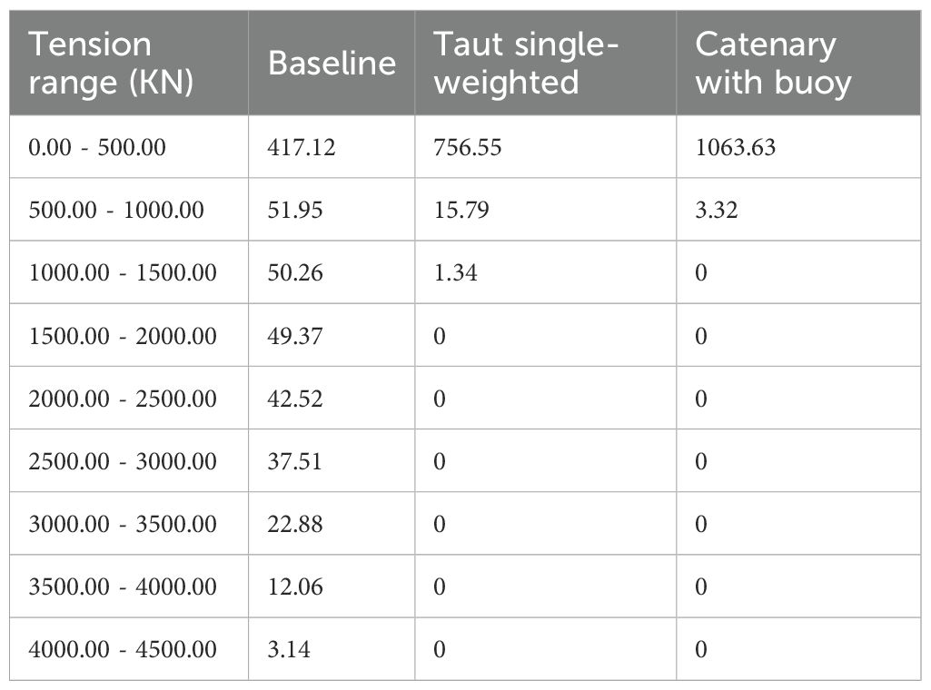 2. A comparative analysis of the three mooring configurations indicates that, in the surge and pitch directions, the motion responses are relatively similar among the configurations; however, significant differences are observed in the heave direction. Compared to the other two configurations, the baseline configuration exhibits more pronounced tension fluctuations. In contrast, the taut single-weighted configuration and the catenary with buoy configuration effectively address the snap events in the shared mooring system under the extreme scenario. Furthermore, the taut single-weighted configuration demonstrates a clear advantage in terms of fatigue damage resistance.