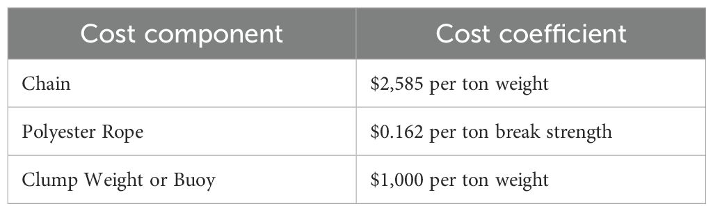 where Lpoly is the length of the polyester rope (m), Wpoly is the dry weight of the polyester rope (t/m), Qpoly is the price per unit weight of the polyester rope (USD/t), Mclump is the mass of the clump weight (t), Qclump is the price per unit weight of the clump weight (USD/t), Lchain is the length of the chain (m), Wchain is the dry weight of the chain (t/m), Qchain represents the price per unit weight of the chain (USD/t), Mbuoy is the mass of the buoy (t), and Qbuoy is the price per unit weight of the buoy (USD/t). The cost assumptions shown in Table 14 refer to the research Hall et al. (2022).