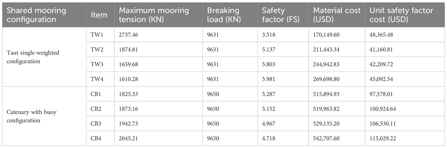 Where FS is the safety factor, MBS is the minimum breaking strength of the shared line (N), and Ft represents the maximum tension of the shared line (N). Based on the mooring line parameters from Table 4, as well as the maximum tension of the shared mooring in the extreme scenario from Tables 11 and 13, the safety factors for the two shared mooring configurations are calculated. Then, combining the material costs provided in Table 15, the unit safety factor cost is calculated, following the concept proposed by (Xu et al., 2025). The relevant results are presented in Table 16, and Figure 21.
