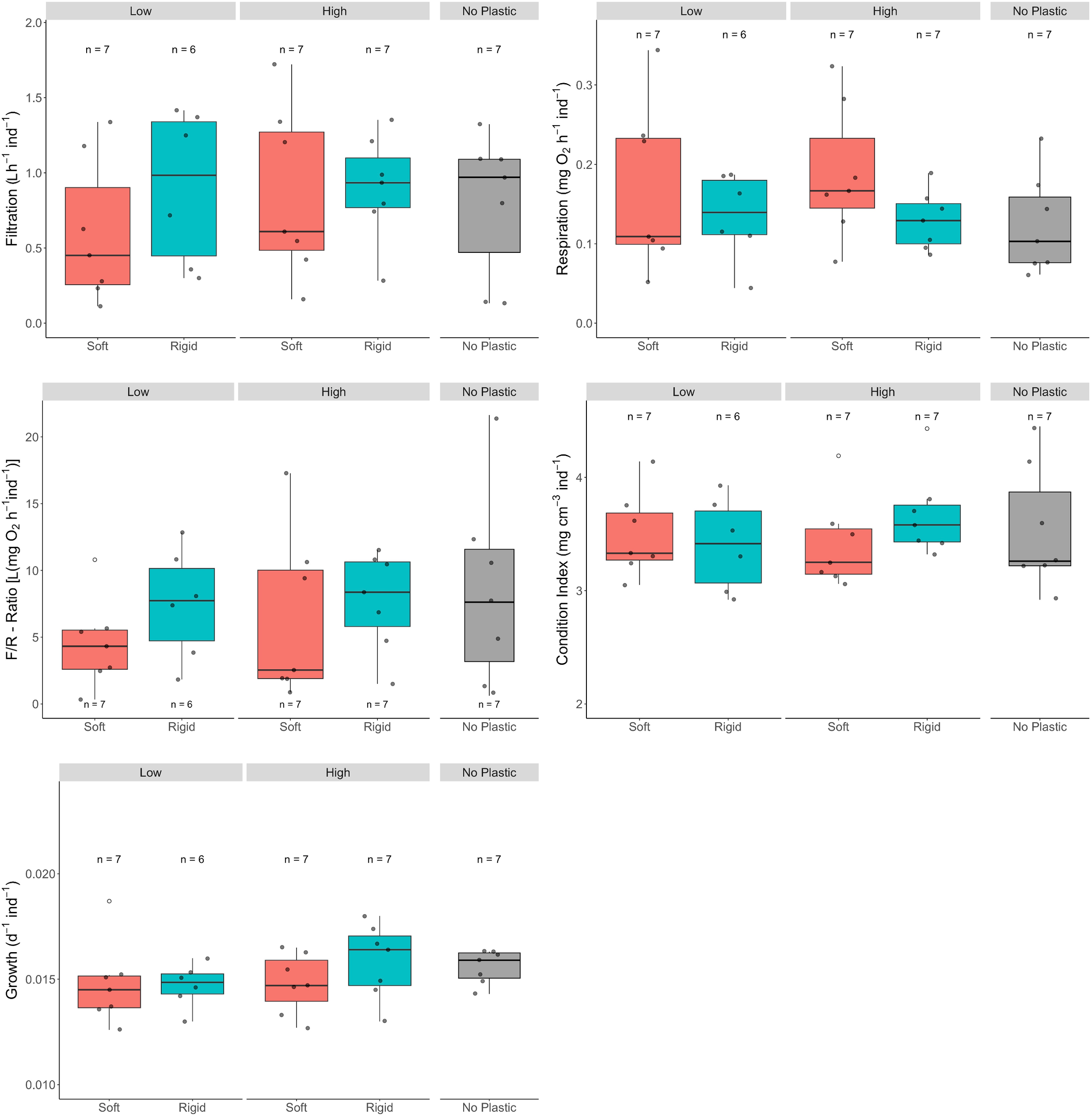Influence of different types (rigid/soft) and amounts (low/high) of planar plastic debris on the filtration rates, respiration rates, F/R-ratio, byssus strength and the growth rates of blue mussels in aggregates that were exposed in the Kerteminde Fjord, Western Baltic Sea, from November 2020 to March 2021.