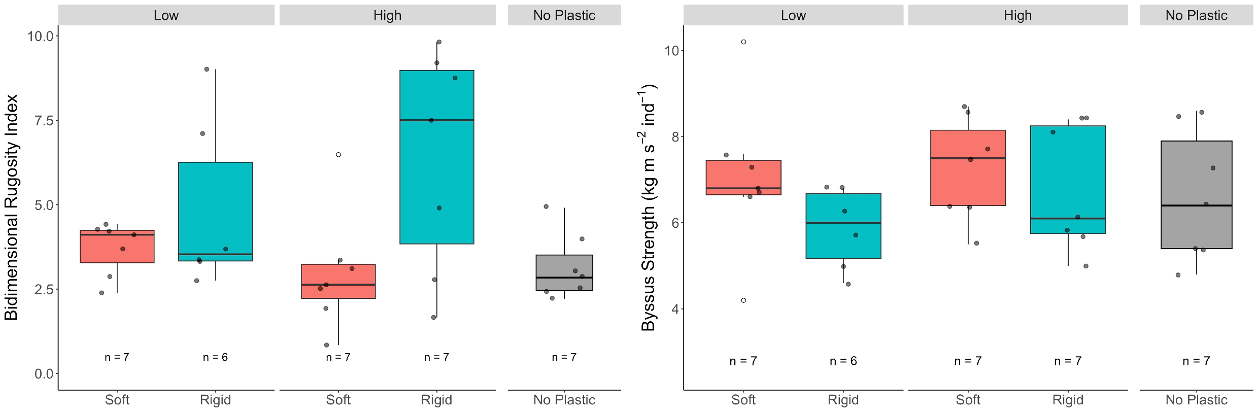 For response variables that followed a normal distribution, i.e. filtration rate, respiration rate, F/R ratio, byssus strength, and growth rate, two-way analyses of variance (ANOVAs) were performed to evaluate the effects of the fixed factors “Rigidity” (soft/rigid plastic) and “Amount” (low/high plastic load). For non-normally distributed variables, i.e. the bidimensional rugosity index and the condition index, generalized linear models (GLMs) with a gamma error structure were applied. The assumptions of normality and homoscedasticity in the residuals were tested using the Shapiro-Wilk’-W test (Shapiro and Wilk, 1965) and the Fligner-Killeen test (Dolby, 1976), respectively. To compare the control aggregates without plastic with specific groups of the plastic-contaminated aggregates, pairwise comparisons were performed using either Student’s t-tests (Student, 1908; for normally distributed data) or Mann-Whitney-U tests (McKnight and Najab, 2010; for non-normal data). These comparisons were made between the control group and four pooled treatment groups: (a) all aggregates with rigid plastic, (b) all aggregates with soft plastic, (c) all aggregates with a high plastic load, and (d) all aggregates with a low plastic load. To account for repeated comparisons involving the same control group, the significance threshold was conservatively set to p ≤ 0.01. Statistical tests were conducted in R version 4.0.3 (R Core Team, 2020) by using the packages car, FSA, lattice and rcompanion (Fox & Weisberg, 2019; Mangiafico, 2016; Ogle et al., 2015; Sarkar, 2001). Figures 1 and 2 were created using the plugin ScientiFig (Aigouy & Mirouse, 2013) in Fiji (Schindelin et al., 2012) and Figures 3, 4 and 5 in R version 4.0.3 (R Core Team, 2020) using the packages ggplot2, Hmisc, cowplot, ggpubr, gridExtra, patchwork and dplyr (Auguie, 2010; Harrell Jr, 2003; Kassambara, 2016; Pedersen, 2019; Wickham, 2016; Wickham et al., 2023; Wilke, 2015).