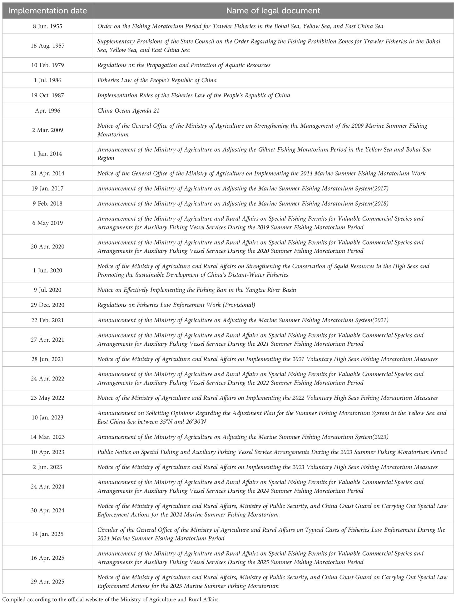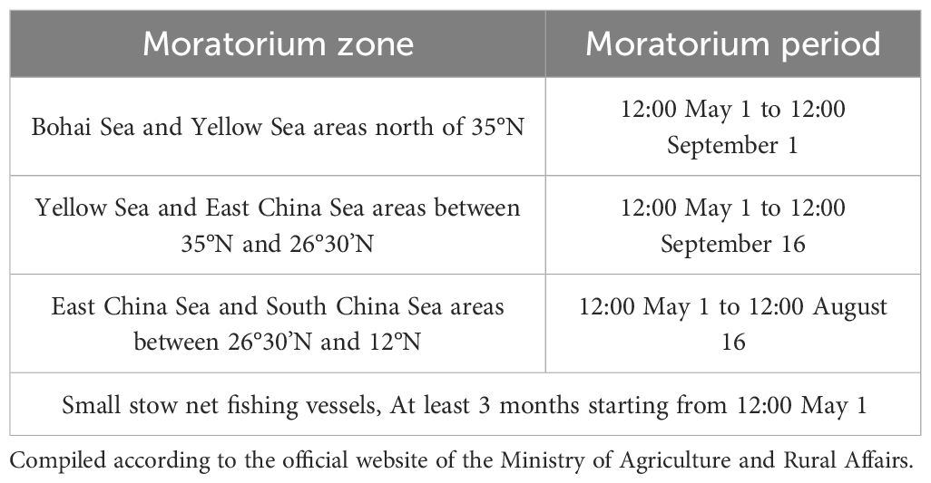 In 1995, the Ministry of Agriculture of China issued the “Notice on Revising the Regulations on the Production Arrangement and Management of Major Fishing Grounds and Fishing Seasons in the East China Sea, Yellow Sea and Bohai Sea”, officially implementing the fishing moratorium system in the Yellow Sea and East China Sea, stipulating that in the waters from 27°N to 35°N, trawler operations (except beam shrimp trawling) and stow net fishing vessel operations are prohibited from July 1 to August 31 each year (Pan and Li, 2016). This document is of historic significance as it formally established China’s summer fishing moratorium system. The establishment of China’s summer fishing moratorium system underwent a long process of practice and adjustment. In 1980, the former State Bureau of Aquatic Products issued the “Notice on the Summer Fishing Moratorium for Collective Trawlers and Joint Inspection of Juvenile Fish Ratios in State-Owned Fishing Vessels”, requiring a two-month moratorium (July and August) for collective trawlers in the Yellow Sea area and a four-month moratorium (July to October) for collective trawlers in the East China Sea area; in 1987, the Ministry of Agriculture issued the “Regulations on the Production Arrangement and Management of Major Fishing Grounds and Fishing Seasons in the East China Sea, Yellow Sea and Bohai Sea”, requiring a moratorium from July to October for trawlers under 250 horsepower (except beam shrimp trawling) in the waters from 24°30’N to 34°N; five years later in 1992, the protected sea area was expanded again, requiring a moratorium on all bottom trawling operations (except beam shrimp trawling) in the waters from 27°N to 35°N (Dai et al., 2018).