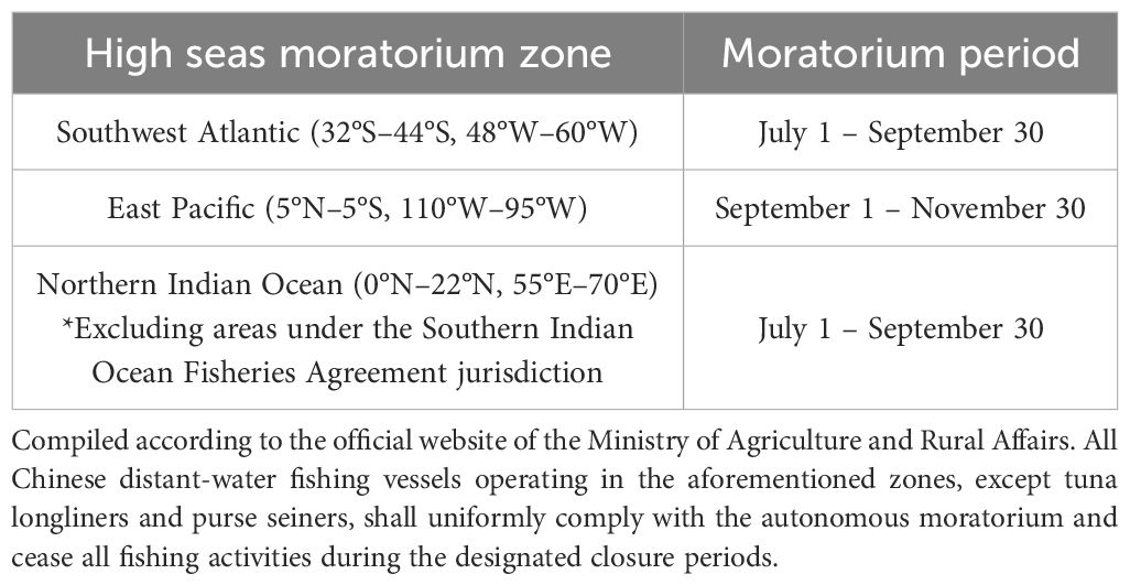 As a party to the United Nations Convention on the Law of the Sea (UNCLOS), China consistently advocates integrating development with conservation. It has independently implemented a fishing moratorium system to protect marine resources, enforce fisheries conservation policies, and promote long-term sustainable resource utilization. After years of development, China initiated its first high seas autonomous moratorium in July 2020—a three-month seasonal closure targeting squid resources in parts of the Southwest Atlantic (Table 3) (CMARA (China’s Ministry of Agriculture and Rural Affairs), 2020). This measure involves the voluntary withdrawal of China’s distant-water fishing fleet from certain high seas areas where they routinely operate.