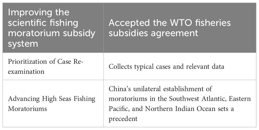 On June 28, 2023, China officially accepted the WTO Fisheries Subsidies Agreement (FSA) and will engage constructively in Phase 2 negotiations (MCPRC (Ministry of Commerce of the People’s Republic of China), 2023). In accordance with the WTO Agreement, China is establishing and improving its fishing moratorium compensation system through legal means to reduce IUU and overfishing in the high seas (Ventura, 2015). For example, during moratorium periods, subsidies are provided to fishermen who lose income sources, preventing illegal fishing activities and ensuring stable implementation of the moratorium system. To further optimize the moratorium’s effectiveness, incentive mechanisms can be introduced to encourage fishermen’s compliance. Conversely, subsidies may be reduced for violations. The primary goal of the subsidy policy is to increase fishermen’s income, offset losses caused by the moratorium, prevent illegal fishing due to economic pressures, and achieve optimal moratorium results (Honniball, 2020).