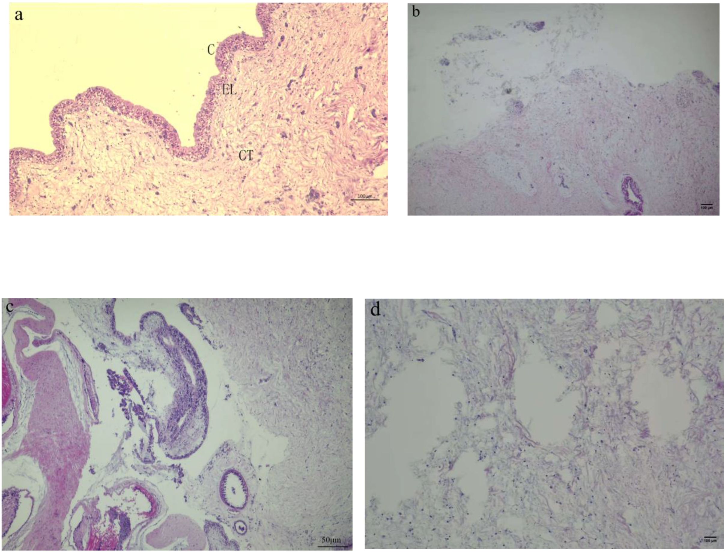 Figure 2. Histopathological change of the body wall of sea cucumbers infected with P. leiognathi 10MKXP20. (A) body wall of healthy control and (B) infected animals with the blur of the boundary between cells and the dissolution and disappearance of the epidermis. Scale bars: 100 μm (A, B, D), 50 μm (C). (C) Stratum corneum; EL, Epithelium layer; CT, Connective tissue. (A, C) are transverse sections, while (B, D) are longitudinal sections.
