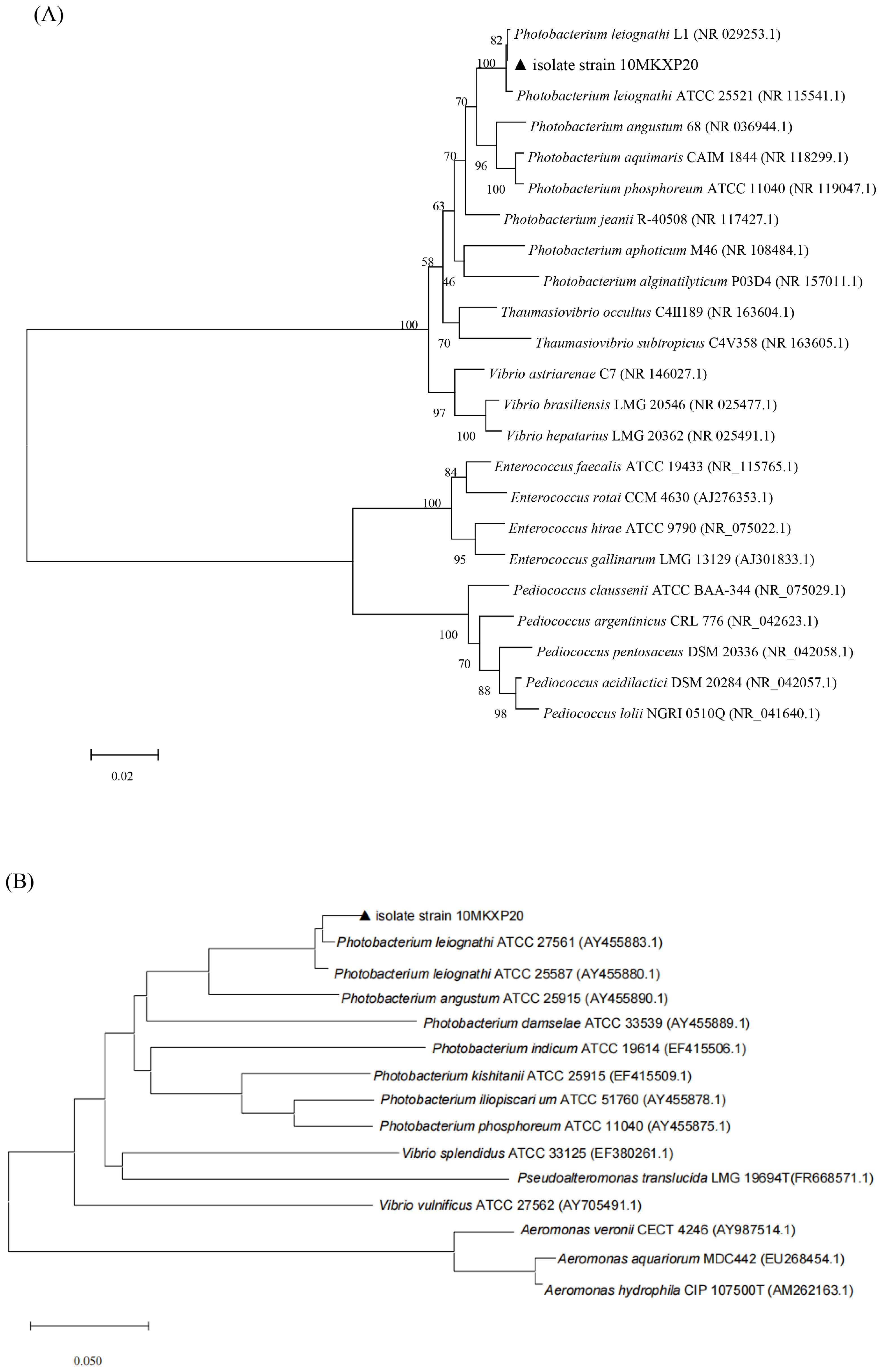Figure 4. Neighbor-Joining tree shows the phylogenetic positions of P. leiognathi 10MKXP20 as compared with P. leiognathi strains isolated from other hosts obtained from GenBank. The evolutionary distances were computed using the Tamura-Nei method and are in units of the number of base substitutions per site. The percentage of replicate trees in which the associated taxa clustered together in the bootstrap test (1,000 replicates) is shown next to the branches. The scale bar corresponds to 1 substitution per 100 nucleotide positions. (A) 16S rRNA phylogenetic tree, (B) gyrB phylogenetic tree.