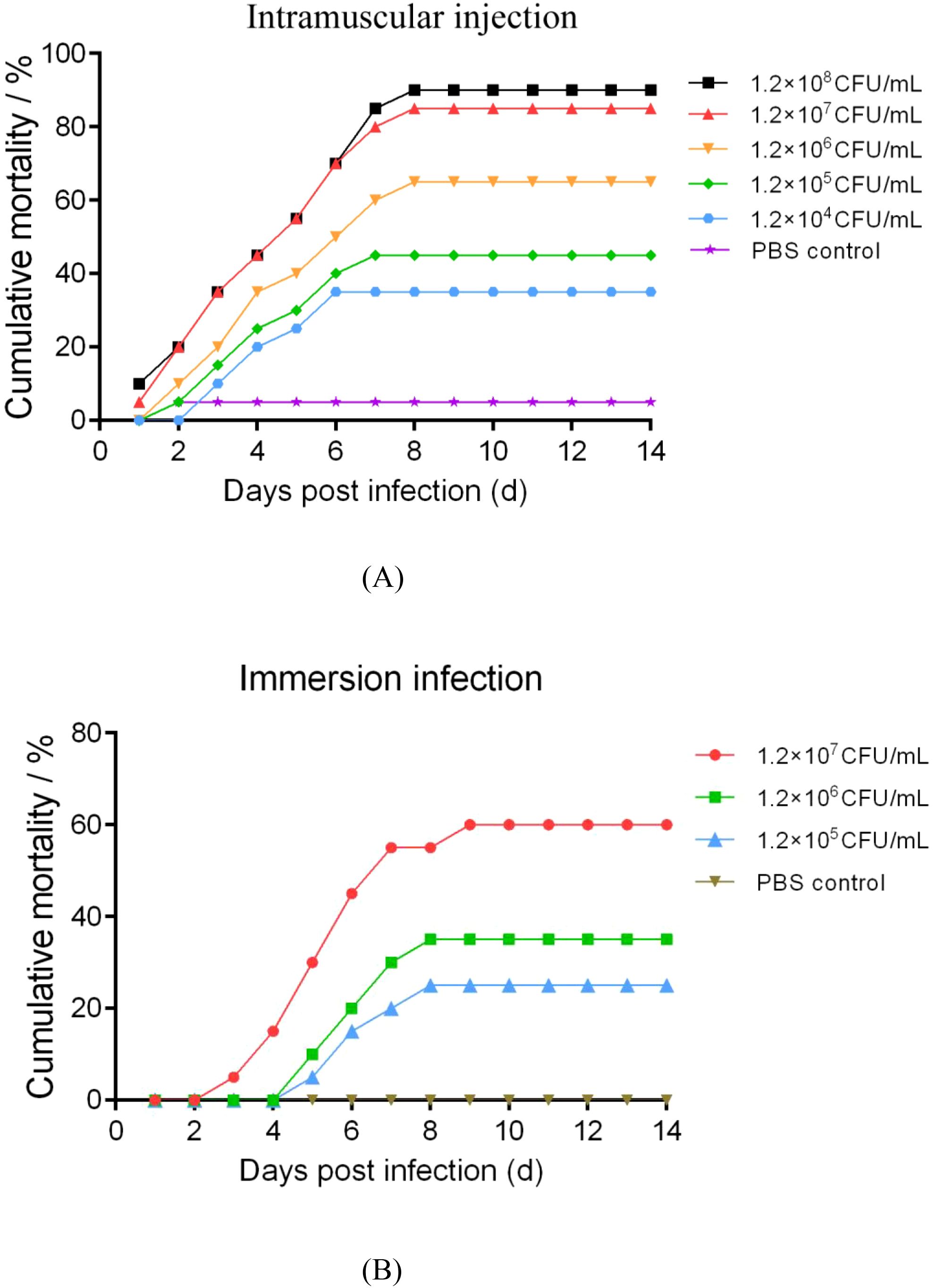 Figure 5. Cumulative mortality of sea cucumbers artificially infected with Photobacterium leiognathi 10MKXP20 by intramuscular injection (A) and immersion (B) infections.