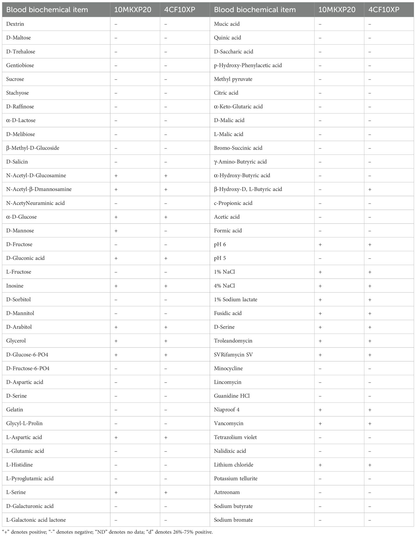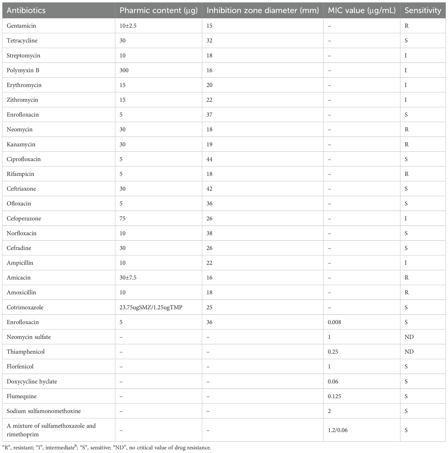 The drug sensitivity of pathogenic bacteria was analyzed by the agar plate diffusion method (K-B method) (Wang et al., 2022). Single colonies of strain 10MKXP20 were collected and placed in sterile saline to produce a suspension with a concentration of about 1.2×108 CFU/mL (0.5 MJ). The chemotherapeutic agent discs (Binhe Microbiology Reagent, Hangzhou, China) were placed on the surface of the plates. The plate was incubated at 25°C for 18 h and used for the measurement of the inhibition zone diameter. MIC values of the pathogenic bacteria against eight kinds of antimicrobial agents permitted for use in aquaculture by the Ministry of Agriculture and Rural Affairs (China) were determined by the micro-method (Wang et al., 2022). The suspension of P. leiognathi 10MKXP20 was prepared at a concentration of 2.2×106 CFU/mL for use, and a volume of 200 μL of bacterial suspension was added to the 96-well broth microdilution plate (Nanjing Finn Medical Science, Nanjing, China). The test plate was cultured at 25°C for 18 h, and the results were observed. The sensitivity of the pathogen to the drug was judged by reference to the Clinical and Laboratory Standards Institute (CLSI) (Walker, 1999).