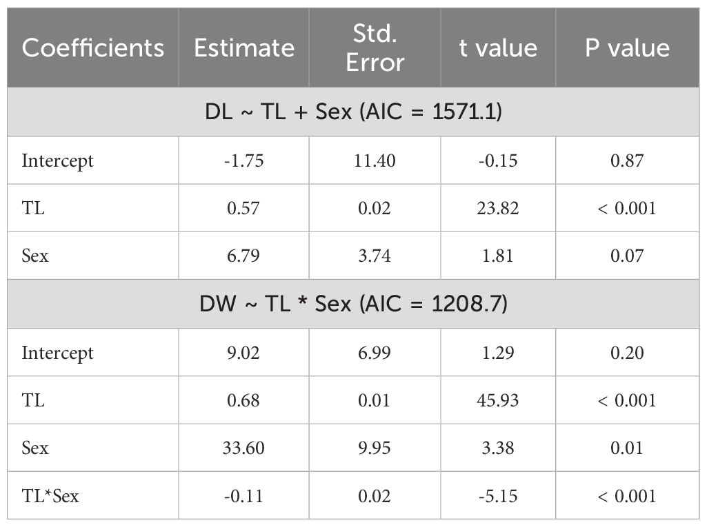 The selected linear model for DL includes TL and sex as predictors, whereas in the model for DW the TL, sex, and their interaction were retained (Table 1). In the DL model, TL emerged as a highly significant driver associated with an increase in DL (p < 0.001) - while the effect of sex did not reach statistical significance (p ≈ 0.07). In the DW model, total length again emerged as a highly significant positive predictor (p < 0.001; Table 1). The main effect of sex was also significant (p = 0.0009), indicating that, at a given TL, females exhibit a larger DW than males. Crucially, the TL × sex interaction proved highly significant (p < 0.001), revealing that the rate at which DW increases with body size is lower in males than in females. This interaction structure drove the DW model to explain 94.5% of the variance in width (adjusted R² = 0.944), underscoring a pronounced, sex‐specific allometric pattern.