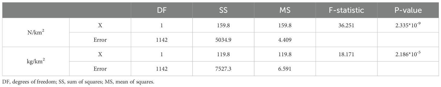 The frequency of occurrence of starry ray in the SoleMon survey catches increased over time (Supplementary Table 1). This positive trend was also observed for the relative abundance (N/km2) and biomass (kg/km2) of the species (Figures 9A, B). Although with fluctuations, the average values of these population parameters have shown a significant increasing trend during the years (Table 5). The lowest values (less than 15 N/km2 and 5 kg/km2) were recorded between 2007 and 2012, and the highest starting from 2020 (more than 40 N/km2 and 15 kg/km2). The drop in abundance recorded in 2022 was caused by the drastic reduction in monitored stations due to adverse events (i.e., exceptionally bad weather conditions and COVID-19 pandemic issues).