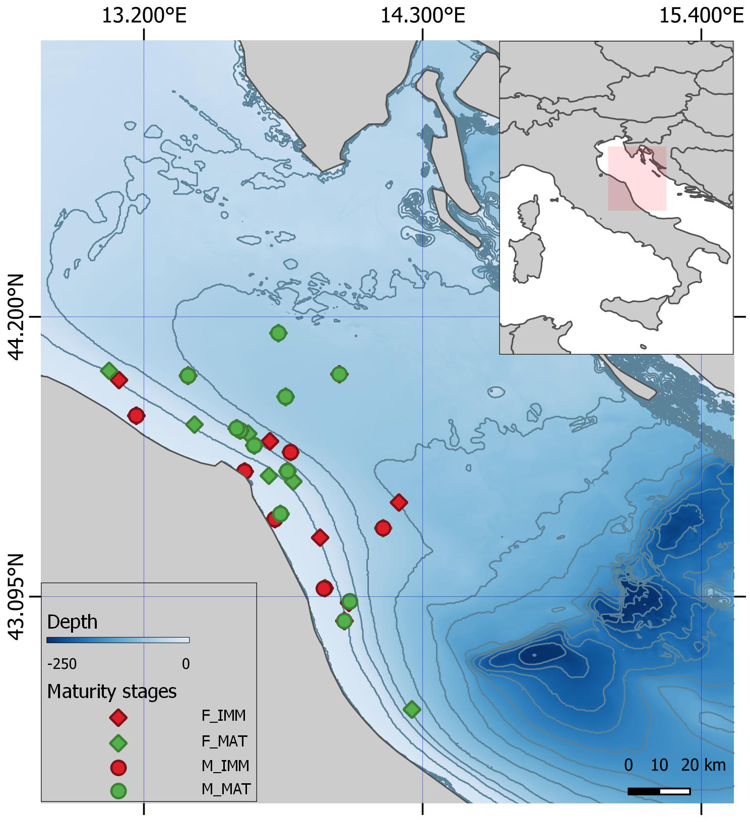 Map of the starry ray individuals sampled over the period December 2019 – November 2023 during fishery dependent and independent sea trials with reference to sex (M, F) and maturity stage (mature, immature). Dark lines represent isobaths set every 20 m of depth.