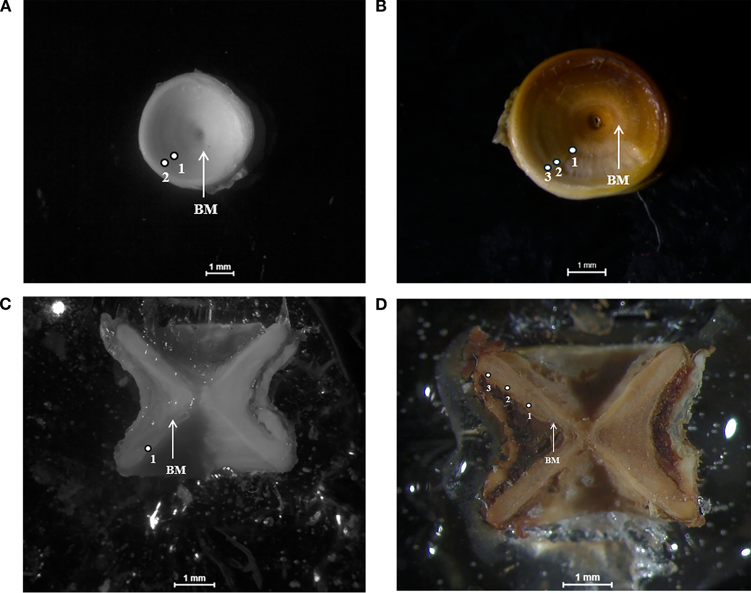 Growth rings visibility between ageing technique for the same R. asterias individual: (A) whole untreated vertebra (WUV), (B) whole treated vertebra (WTV), (C) dissected untreated vertebra (DUV) and (D) dissected treated vertebra (DTV). The presence of the birth-mark (BM) is also reported.