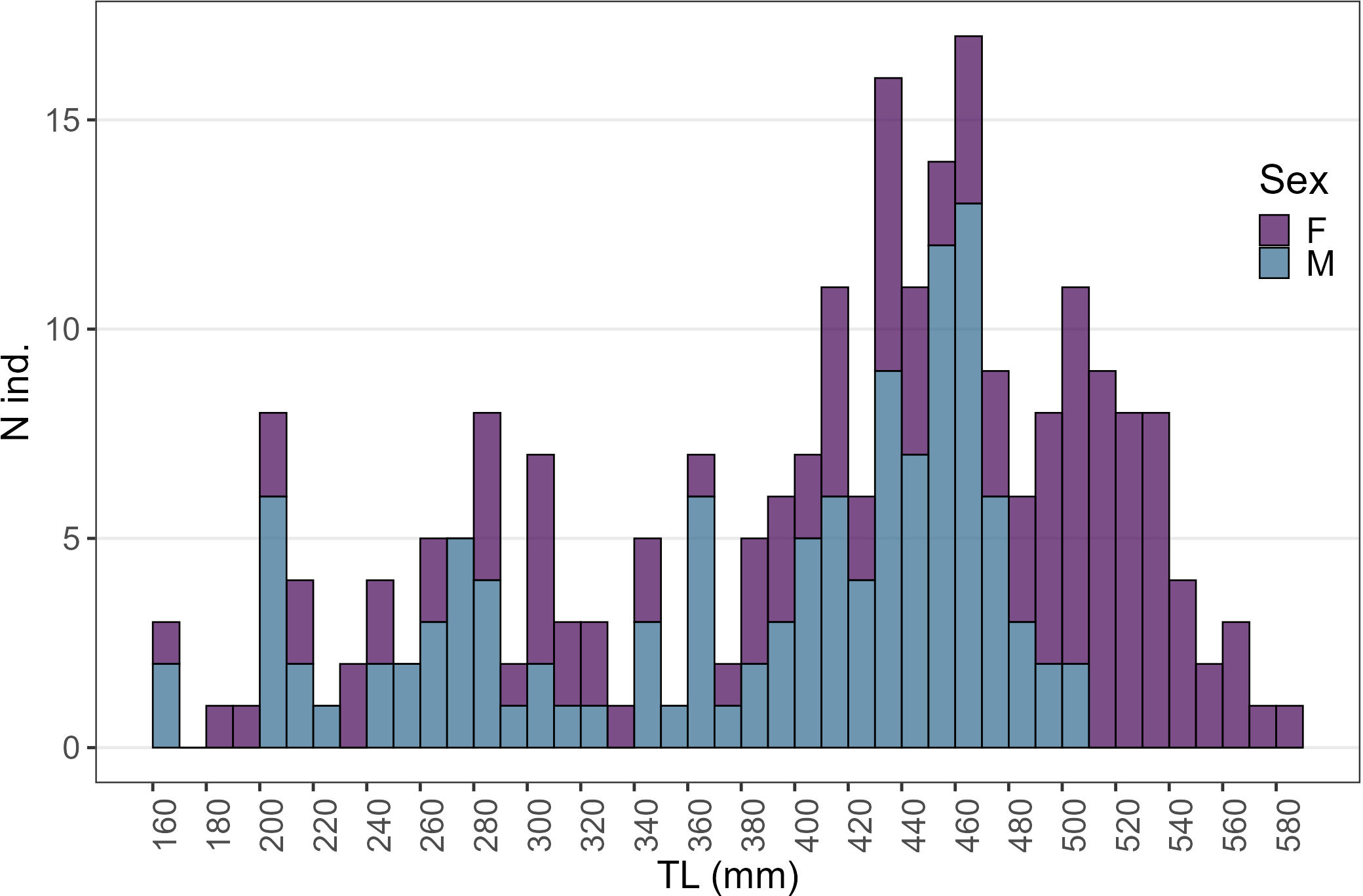 Size at sexual maturity (TL50) was assessed in both sexes by fitting a logistic model to the proportion of mature specimens within each size class (20 mm wide):
