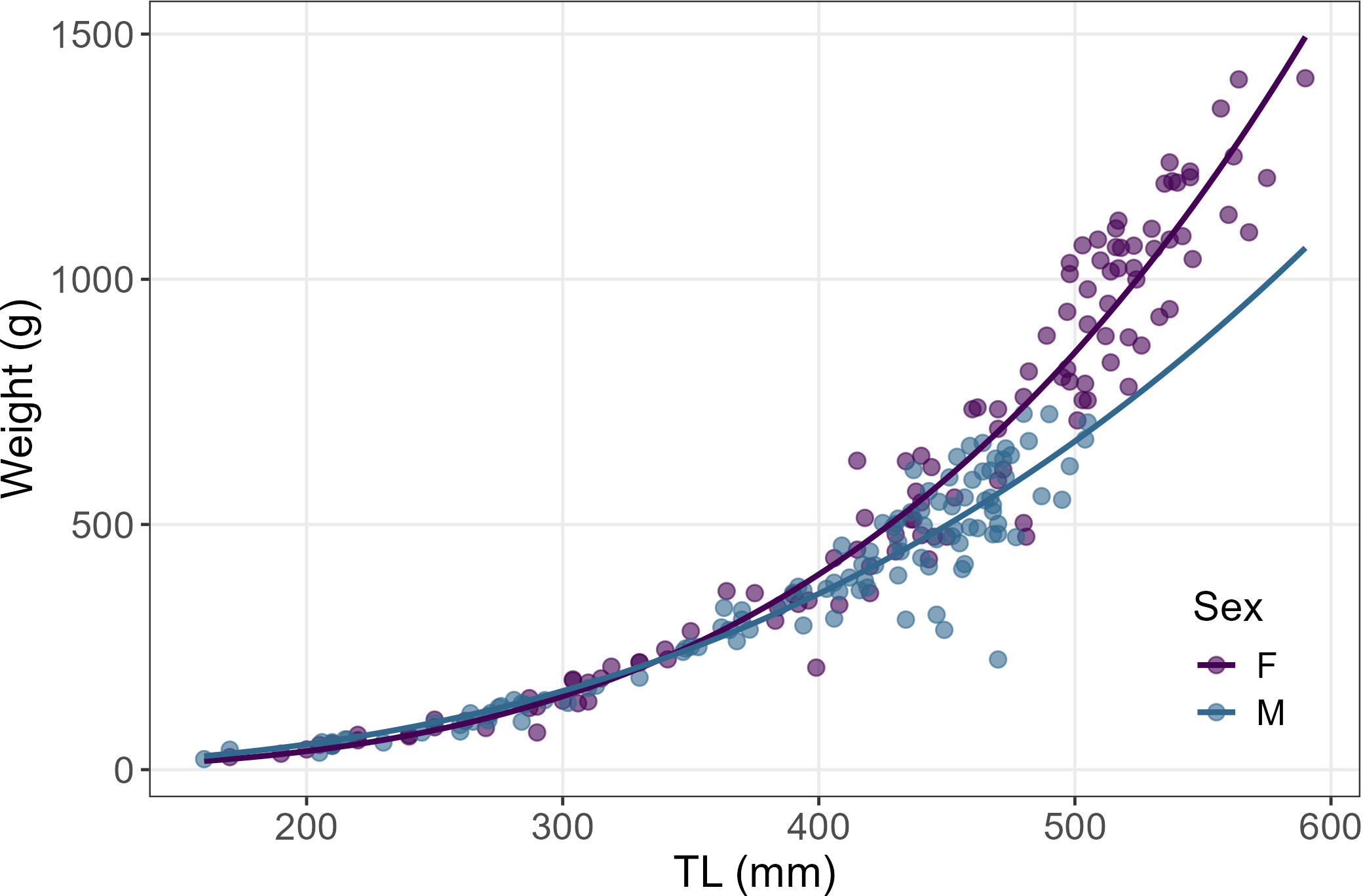 A positive relationship was found between TL and W in both sexes, as summarized in the following equations: