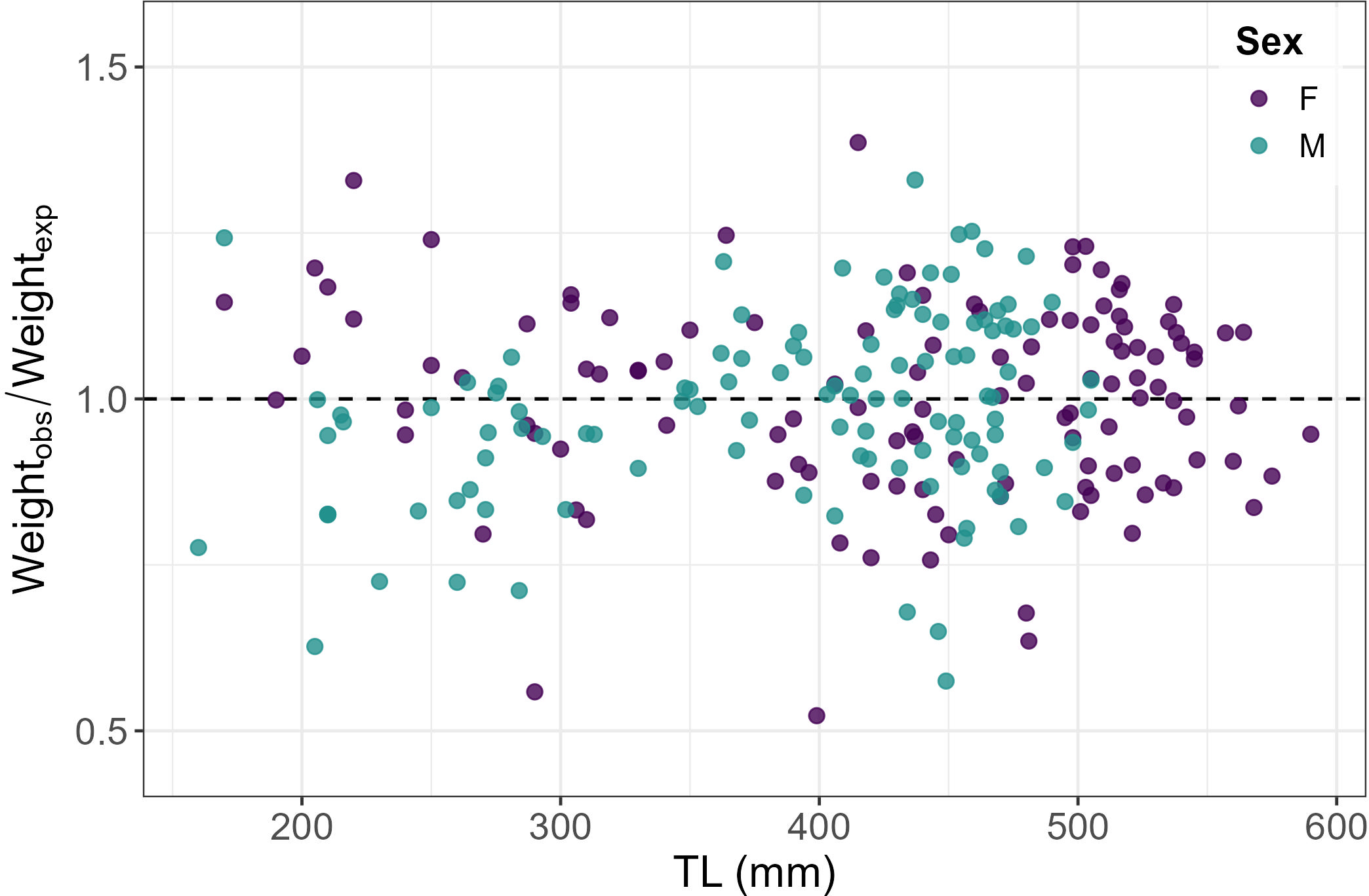 The RCF for both sexes highlighted different physical conditions of the individuals oscillating from under to overweight independently of size (Figure 5).