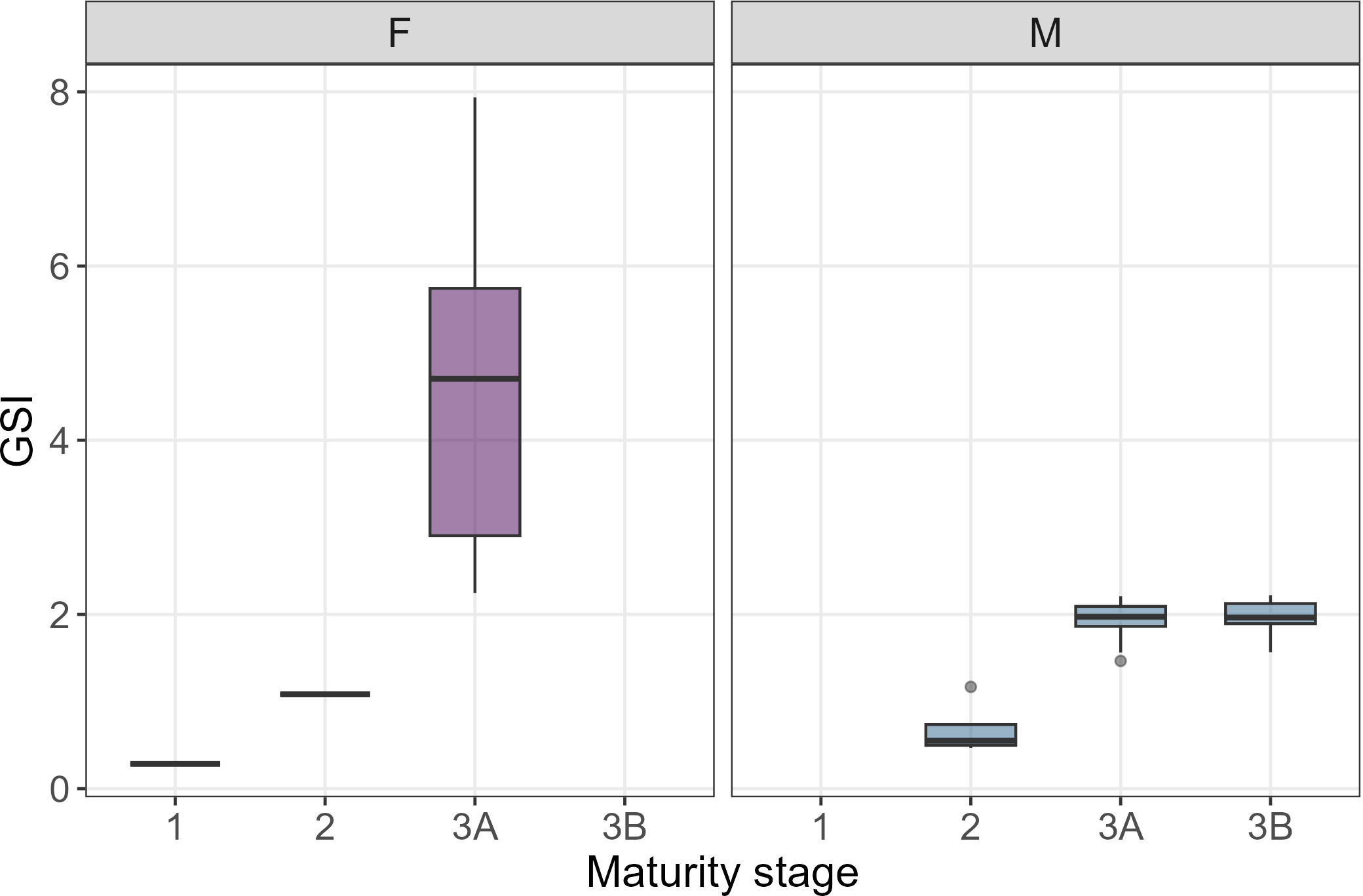 Gonado-somatic Index (GSI) calculated in relation to maturity stage per each sex. Only one gonad’s individual was available for F1 and F2 maturity stages.