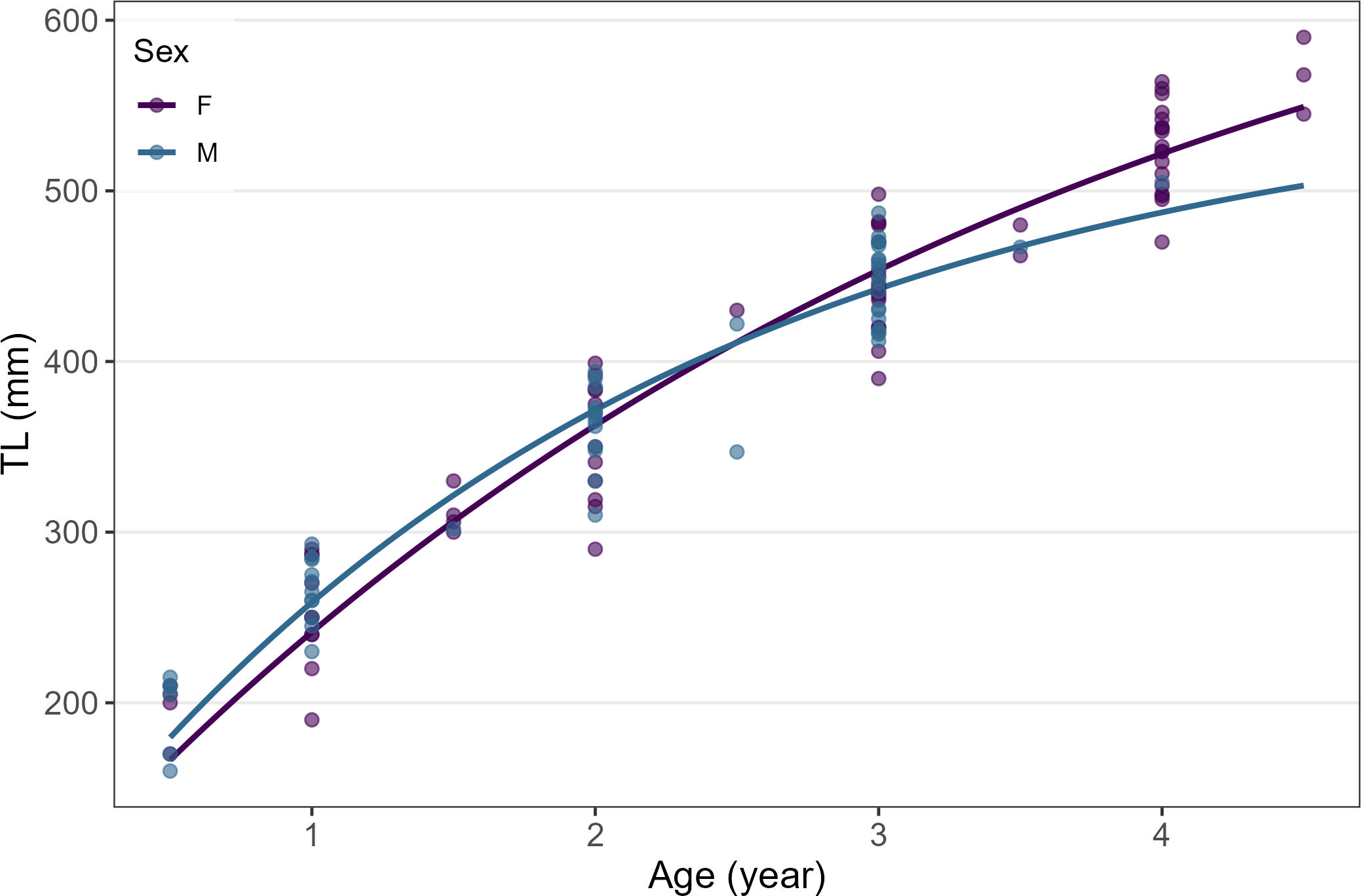 To describe the growth pattern, the modified von Bertalanffy growth model described by Cailliet et al. (2006) where the common parameter t0 (theoretical age at length zero) is replaced with the size at birth (L0), was initially fitted to the length-at-age data estimated for each sex and ageing technique tested: