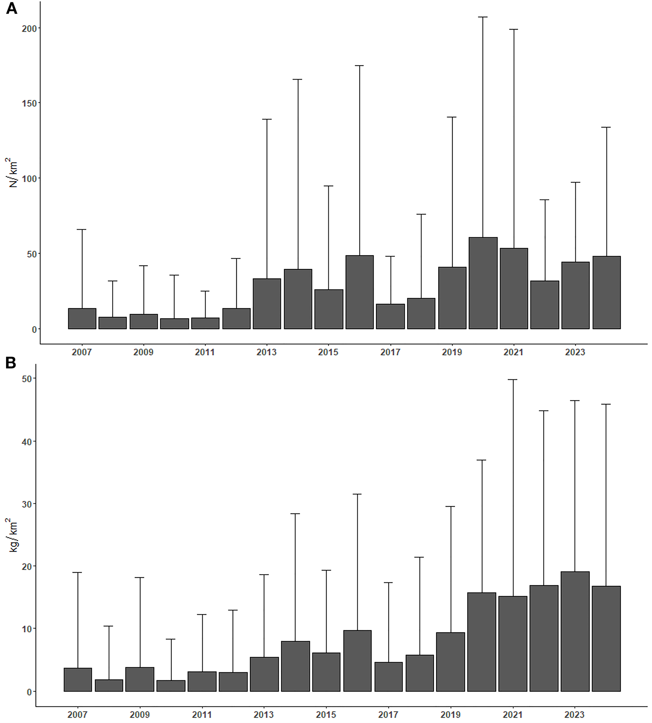 The relative abundance (N/km²) and biomass (kg/km²) of the individuals caught during the SoleMon surveys (2007-2024) were calculated and extracted from the dedicated TruSt database. The presence of a possible significant trend of these population parameters was investigated through a weighted least squares regression (Reddy, 2011).