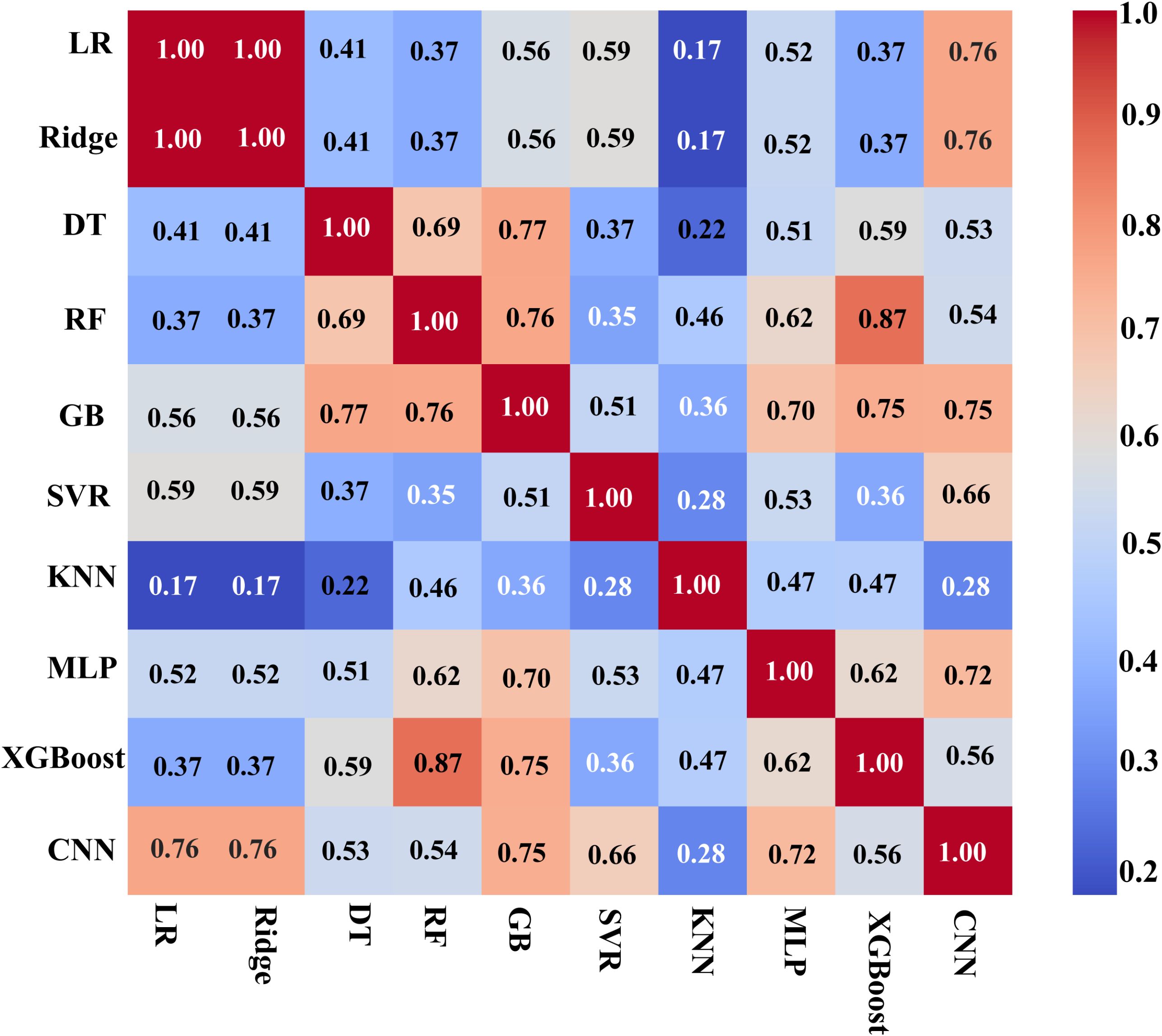 In the fusion modeling framework, Stacking combines the predictions of multiple base models by combining the predictions of multiple base models and then using meta-models to predict the results of the base models again. However, the selection of base models needs to balance the accuracy and diversity of model predictions (Baraheni et al., 2024) in order to avoid overfitting and enhance the fusion effect. In this study, we introduce the residual correlation analysis method (Wang and Chi, 2024) to quantify ten mainstream machine learning models (Tufail et al., 2023): linear regression LR, ridge regression Ridge, decision tree DT, random forest RF, gradient boosting GB, support vector regression SVR, k-nearest neighbor KNN, multilayer perceptron MLP, XGBoost and Convolutional Neural Network CNN (Cira et al., 2023), whose results are shown in Figure 7.