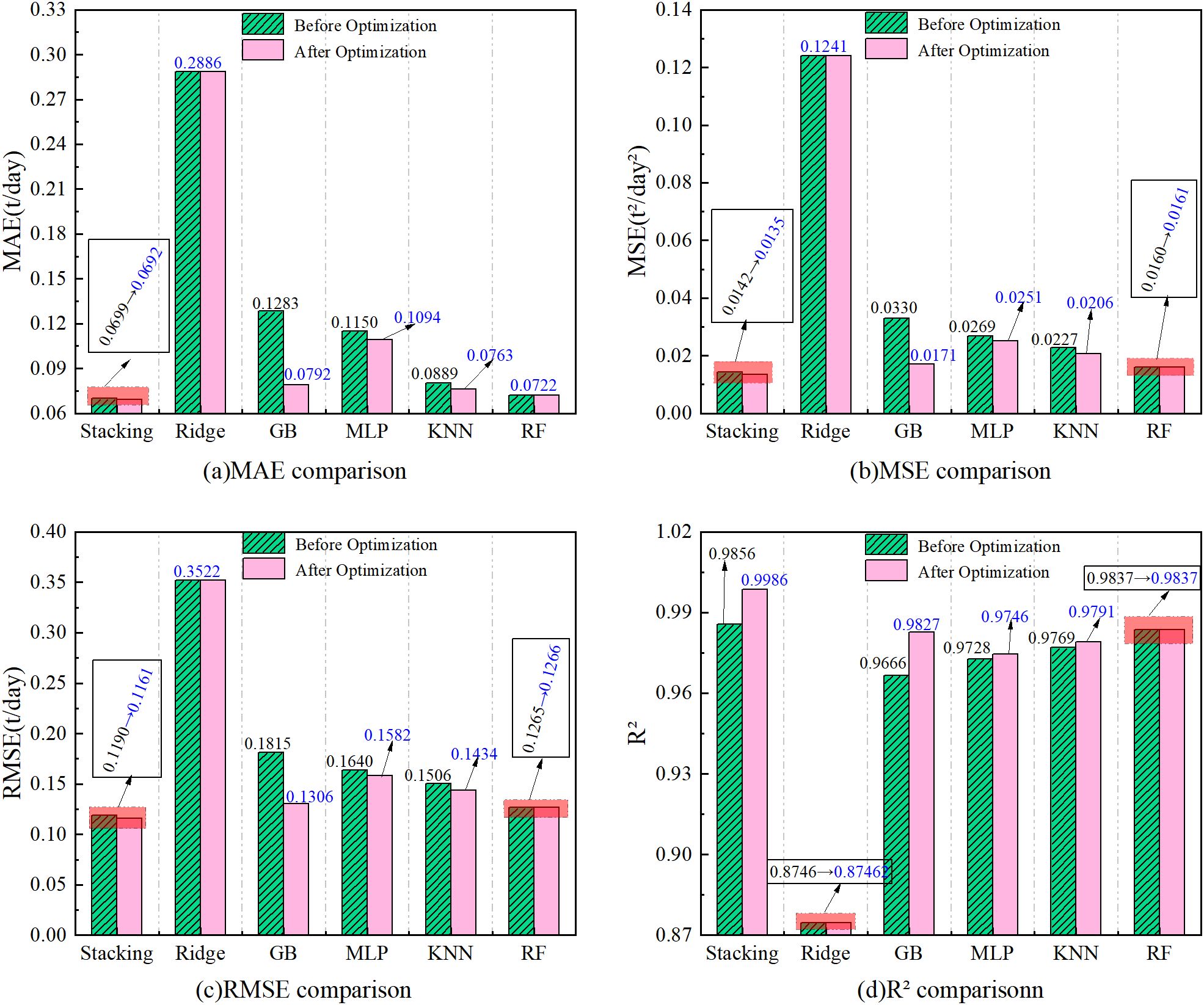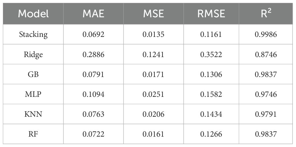 In order to quantitatively measure the difference in prediction performance between the Stacking fusion model and the base model, four types of metrics, Mean Absolute Error (MAE), Mean Square Error (MSE), Root Mean Square Error (RMSE), and Coefficient of Determination (R²), are used in this study.