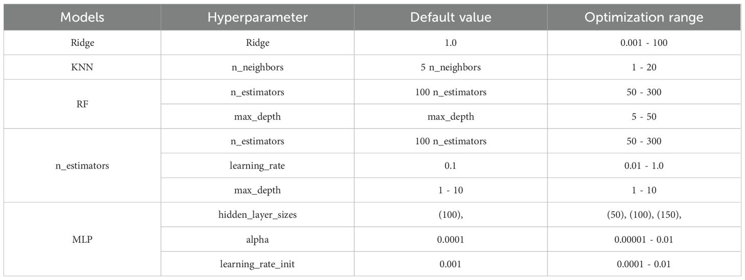 By setting a correlation coefficient threshold (<0.8) (Kuncheva and Whitaker, 2003; Brown et al., 2005), six sets of weakly correlated heterogeneous model combinations (A-F) were screened out from 240 possible combinations, covering linear models, tree models, and neural networks, which to some extent solves the problem of the subjectivity of the selection of the base model in the traditional approach. Taking Combination B (Ridge, GB, MLP, KNN, RF) as an example, the residual correlation coefficients of the base models are between 0.17 (KNN and Ridge) and 0.76 (GB and RF), which contains both high-precision models (GB and RF) and achieves complementary errors by introducing the low-correlation KNN and MLP. Similarly, the combination F (LR, DT, SVR, KNN, XGBoost) covers multiple learning mechanisms while maintaining diversity by fusing linear models (LR), tree models (DT, XGBoost) and kernel methods (SVR). Through the above selection strategy, six representative combinations (A-F) are finally selected and their composition is shown in Table 5.