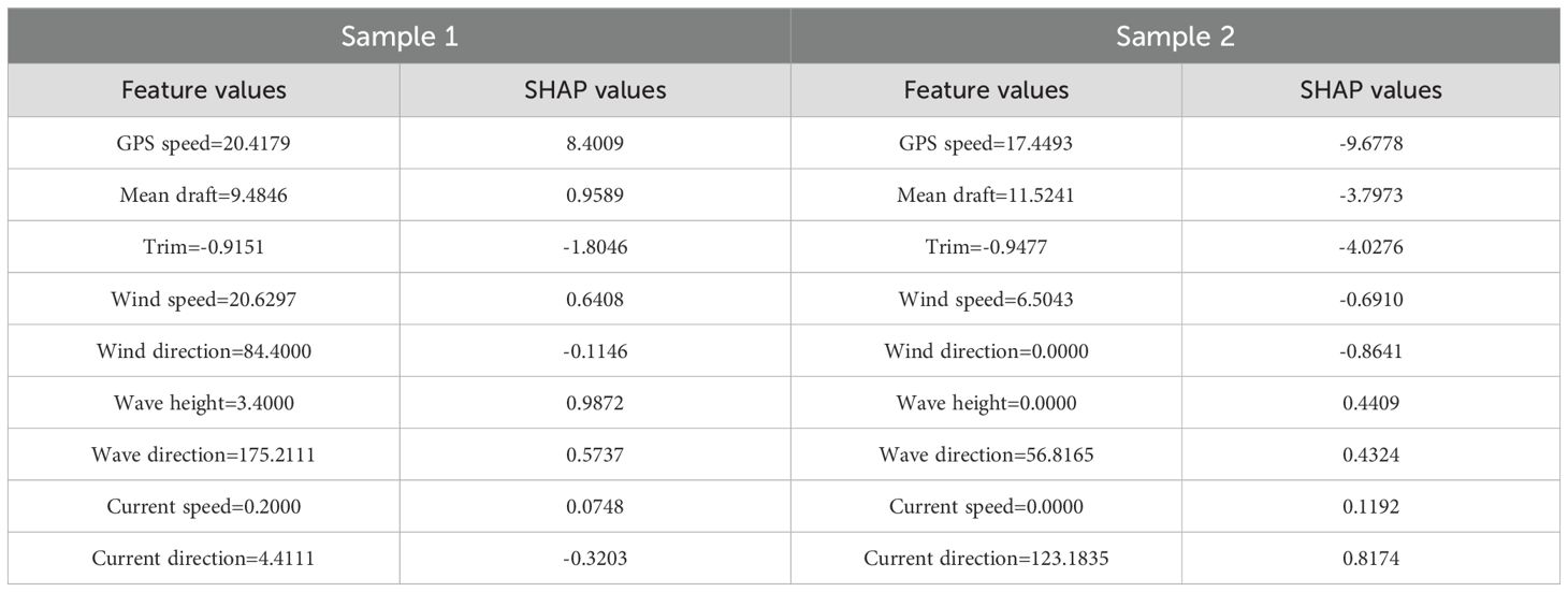 In order to present more clearly the contribution of different features to the prediction of energy consumption of the ship, all the input feature SHAP values for both samples are presented in the table, such as Table 9. A positive SHAP value indicates a positive effect and a negative one a negative effect. In Sample 1, the GPS speed of 20.4179 has a SHAP value of 8.4009, which is the largest positively influenced feature; the wind direction (84.4) and current direction (4.4111) contribute -0.1146 and -0.3203, respectively, which are negatively influenced. The total SHAP value of the nine features is 9.3968, and the baseline value is 119.0899, which results in a predicted value of 128.4861. The total SHAP value of the 9 features is -17.2479, and the baseline value of 119.0892 gives a predicted value of 101.8414. The predicted value is 101.8414.