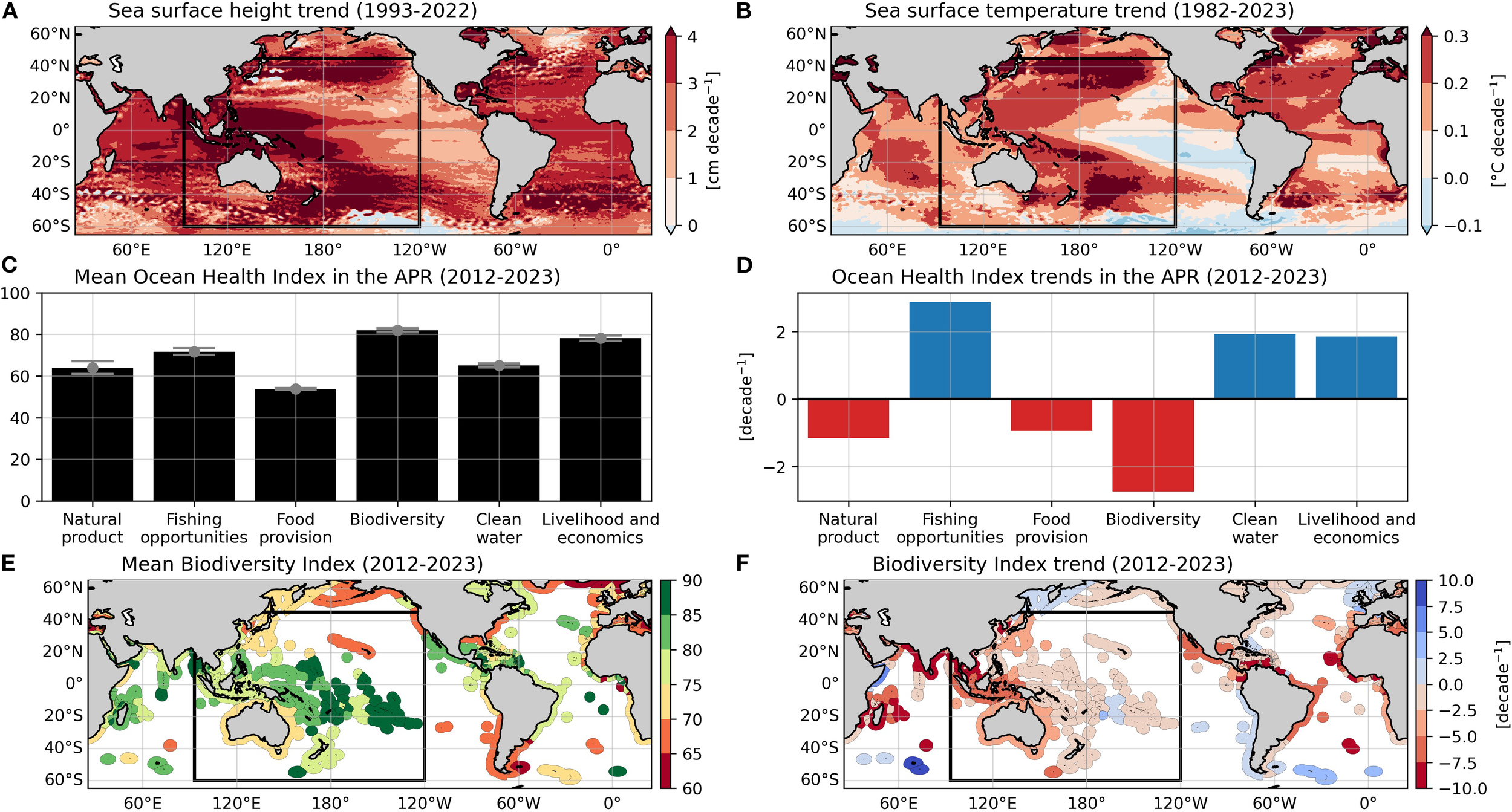 Trends of (A) sea surface height from 1993 to 2022 and (B) sea surface temperature from 1982 to 2023. (C) Average scores of Ocean Health Index (OHI) components in the APR. The error bars indicate one standard deviation of the annual mean. (D) Trends of OHI components in the APR from 2012 to 2023. (E) Average scores of the biodiversity component of the OHI. (F) Trend of the biodiversity component from 2012 to 2023. The trends are calculated by using linear regression. The black box (93°E-120°W, 60°S-45°N) indicates the APR.