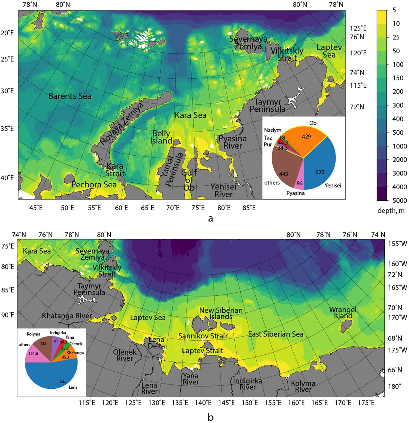 Figure 1. Bathymetry map of the Kara Sea (a), Laptev Sea and East Siberian Sea (b) (GEBCO Compilation Group, 2025). The histograms at the insets show average annual discharge values of the major rivers in km3 based on (Gordeev et al., 1996).