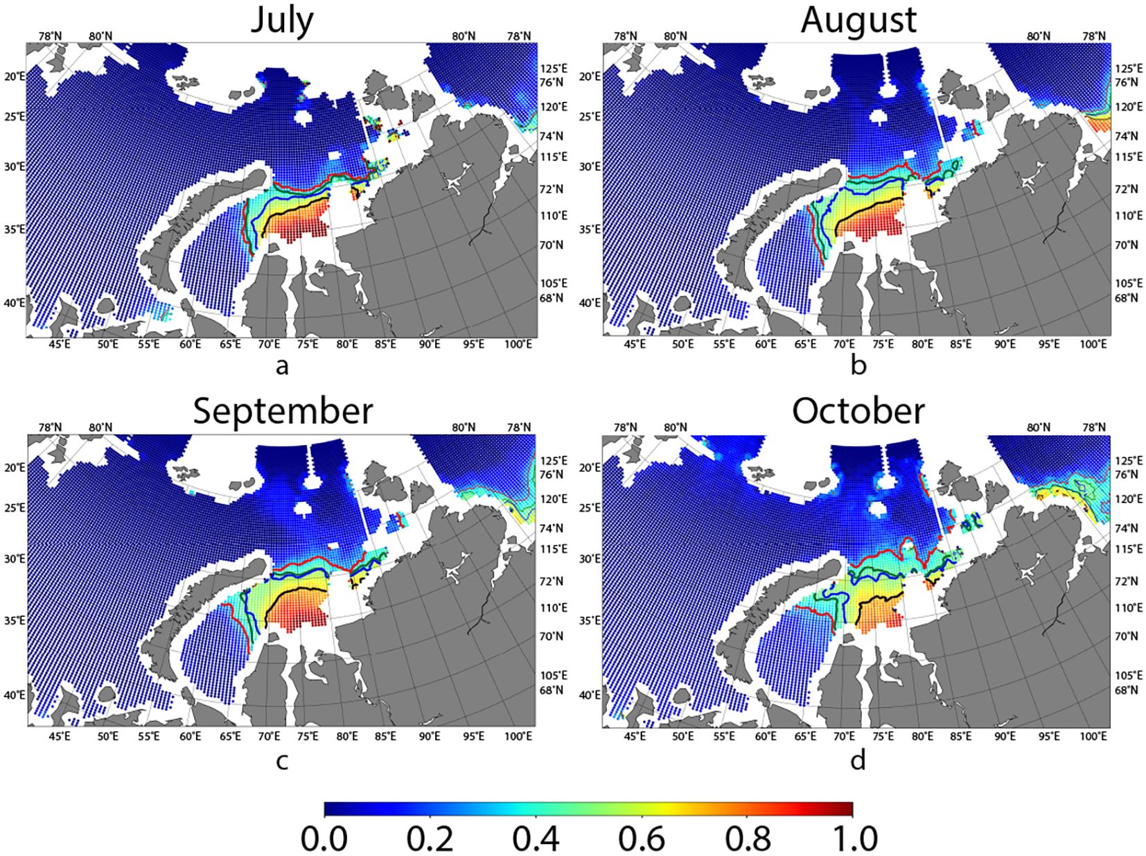 Multiple studies describe the western, central/northern, and eastern spreading types of the Ob–Yenisei plume in the Kara Sea. The novel high-accuracy satellite-derived SSS data made it possible to analyze the statistics of the Ob–Yenisei plume distribution in the Kara Sea. For each grid point, the ratio of the number of days when salinity at this grid point is less than 27 psu (which corresponds to salinity of the Ob–Yenisei plume) to the total number of days with available SSS data (i.e., ice-free conditions) was calculated. Therefore, each grid point is assigned a value from 0 to 1, reflecting how often the Ob–Yenisei plume (or in some cases freshening from recently melted sea ice) occupies this grid point. The results are shown in Figure 2.