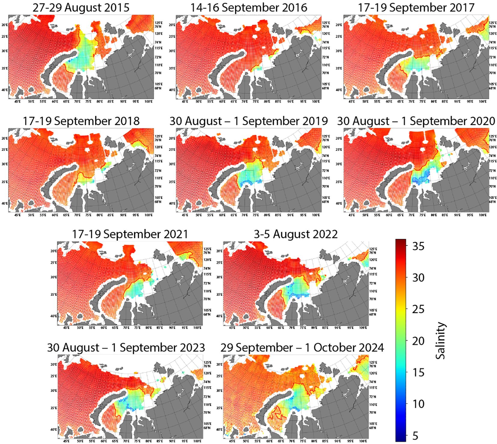 Figure 3. Surface salinity in the Kara Sea during indicative three-day periods in August–September demonstrating spreading type of the Ob–Yenisei plume for each individual year in 2015–2024. Blue and red isolines correspond to the 15 and 27 psu values, respectively.