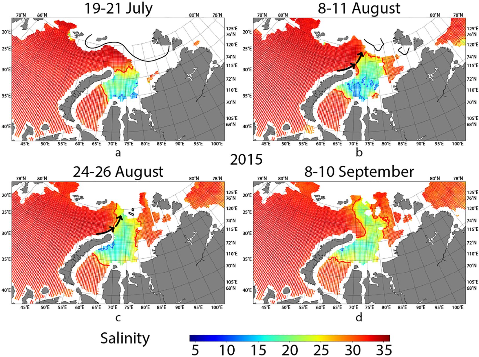 Figure 4. Northern spreading type of the Ob–Yenisei plume in the Kara Sea on 19–21 July (a), 8–11 August (b), 24–26 August (c), and 8–10 September (d) 2015. The black arrows in panels b–c indicate the West Novaya Zemlya Current and its continuation in the northern part of the Kara Sea. Blue and red isolines correspond to the 15 and 27 psu values, respectively. The black lines schematically demostrate location of the ice edge.