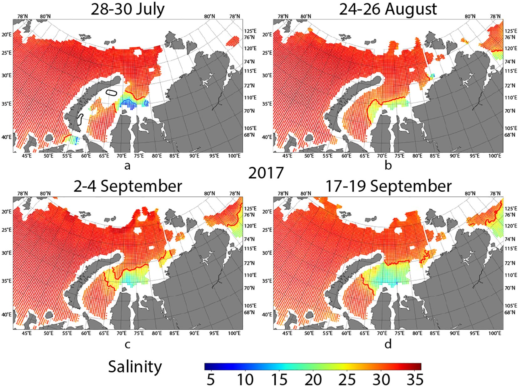 Figure 5. Western spreading type of the Ob–Yenisei plume in the Kara Sea on 28–30 July (a), 24–26 August (b), 2–4 September (c), and 17–19 September (d) 2017. Blue and red isolines correspond to values of 15 and 27 psu, respectively. The black lines schematically demostrate location of the ice edge.