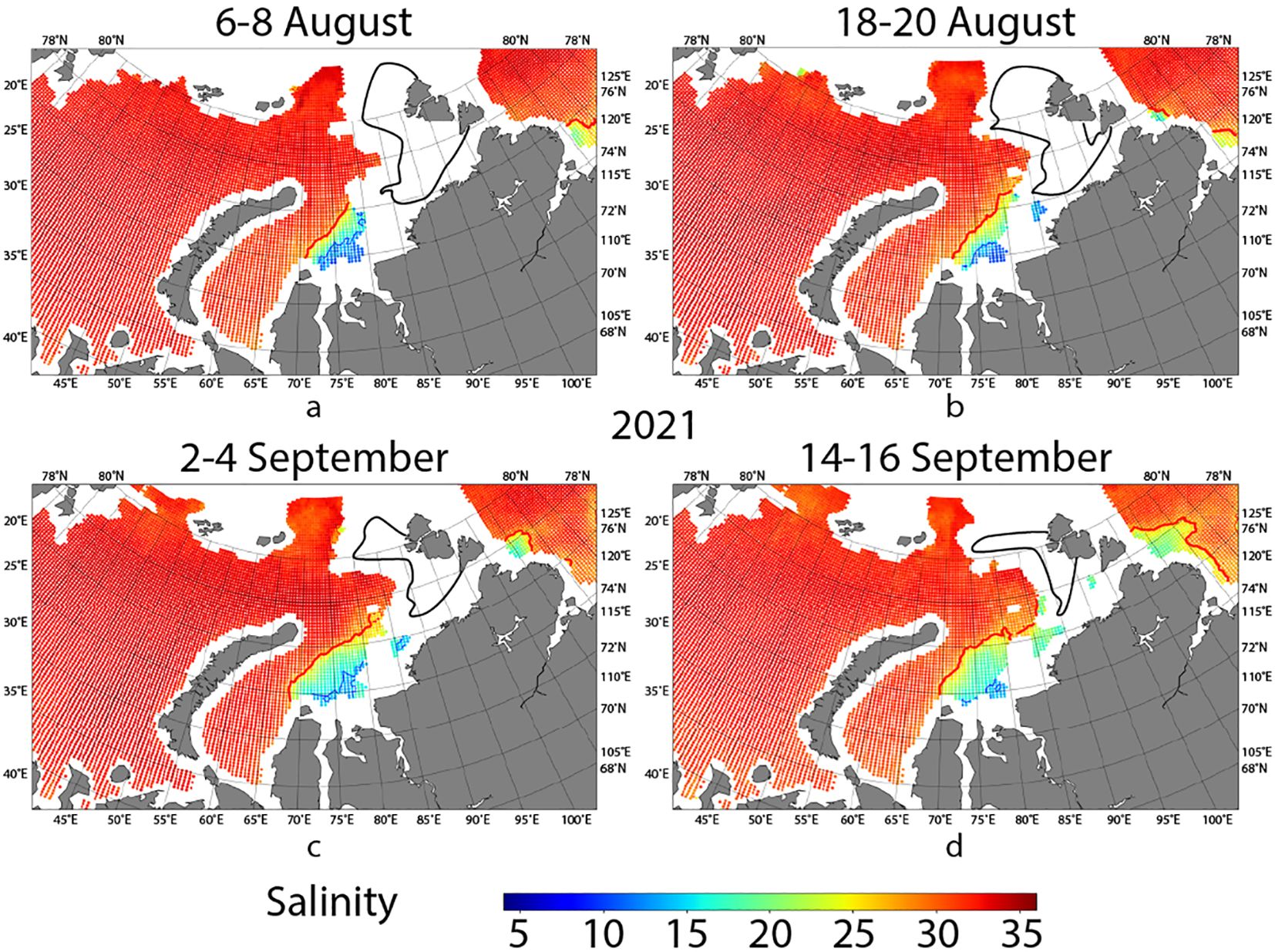 Figure 6. Eastward spreading type of the Ob–Yenisei plume in the Kara Sea and its advection into the Laptev Sea on 6–8 August (a), 18–20 August (b), 2–4 September (c), and 14–16 September (d) 2021. Blue and red isolines correspond to the 15 and 27 psu values, respectively. The black lines schematically demostrate location of the ice edge.