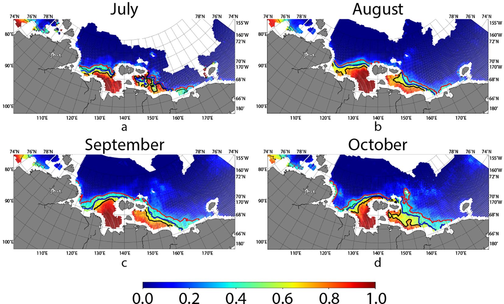 Figure 7. Probability of the Lena plume occurrence in the Eastern Arctic in July (a), August (b), September (c) and October (d) based on SSS data from 2015 to 2024. The red, blue, and black isolines correspond to values 0.3, 0.5, and 0.7, respectively. The green isoline shows 10 years mean Lena plume border determined by averaged position of the isohaline of 25 psu.