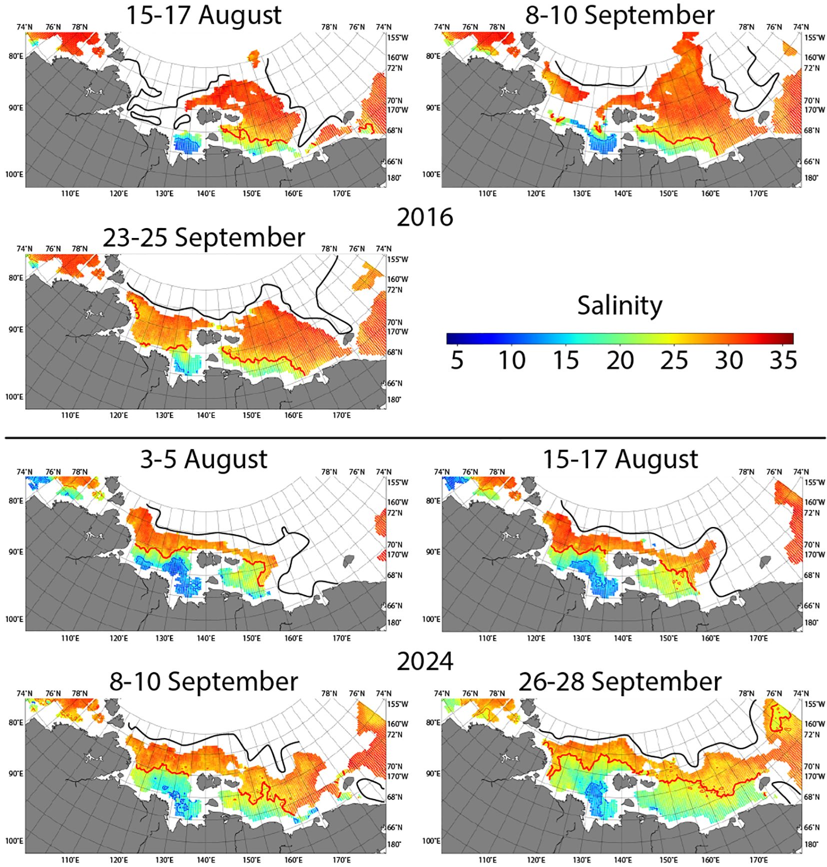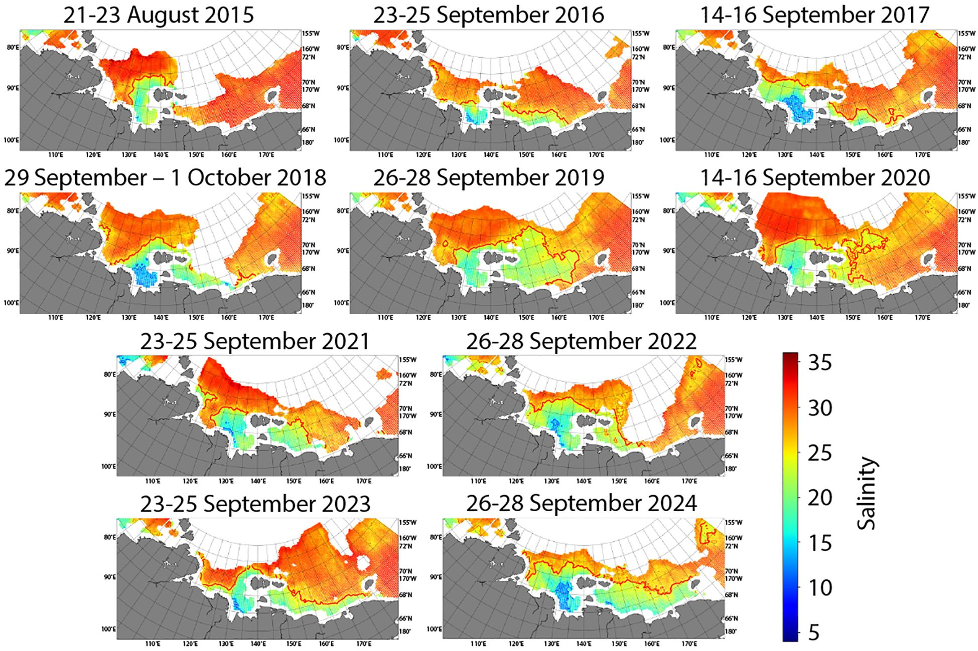 Figure 8. Surface salinity in the Eastern Arctic during indicative three-day periods in August–September demonstrating spreading type of the Lena plume for each individual year in 2015–2024. Blue and red isolines correspond to the 15 and 25 psu values, respectively.