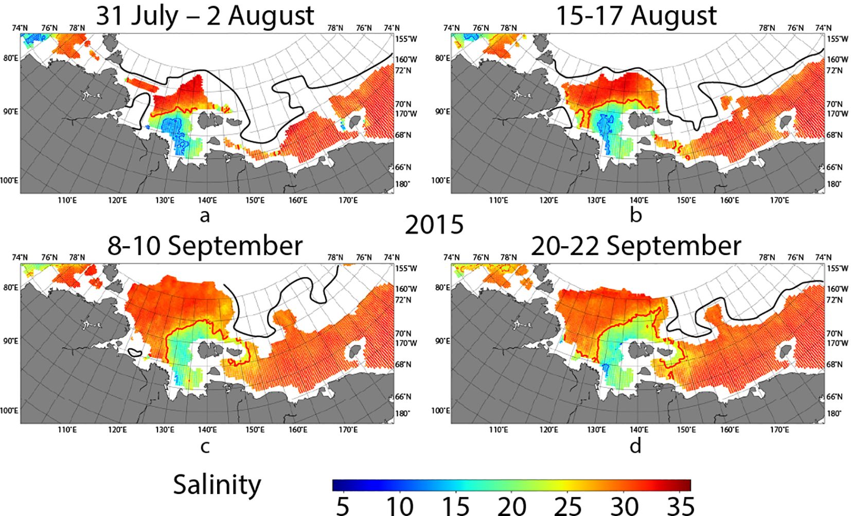 Figure 9. Western spreading type of the Lena plume in the Eastern Arctic on 31 July – 2 August (a), 15–17 August (b), 8–10 September (c), and 20–22 September (d) 2015. The blue and red isolines correspond to the 15 and 25 psu values, respectively. The black lines schematically demostrate location of the ice edge.