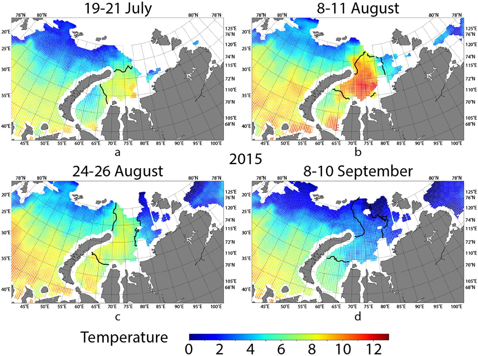 Figure 11. SST in the Kara Sea on July 19–21 (a), August 8–11 (b), August 24–26 (c), and September 8–10 (d) 2015. Black lines show the boundaries of the Ob–Yenisei plume according to SSS data (Figure 4).