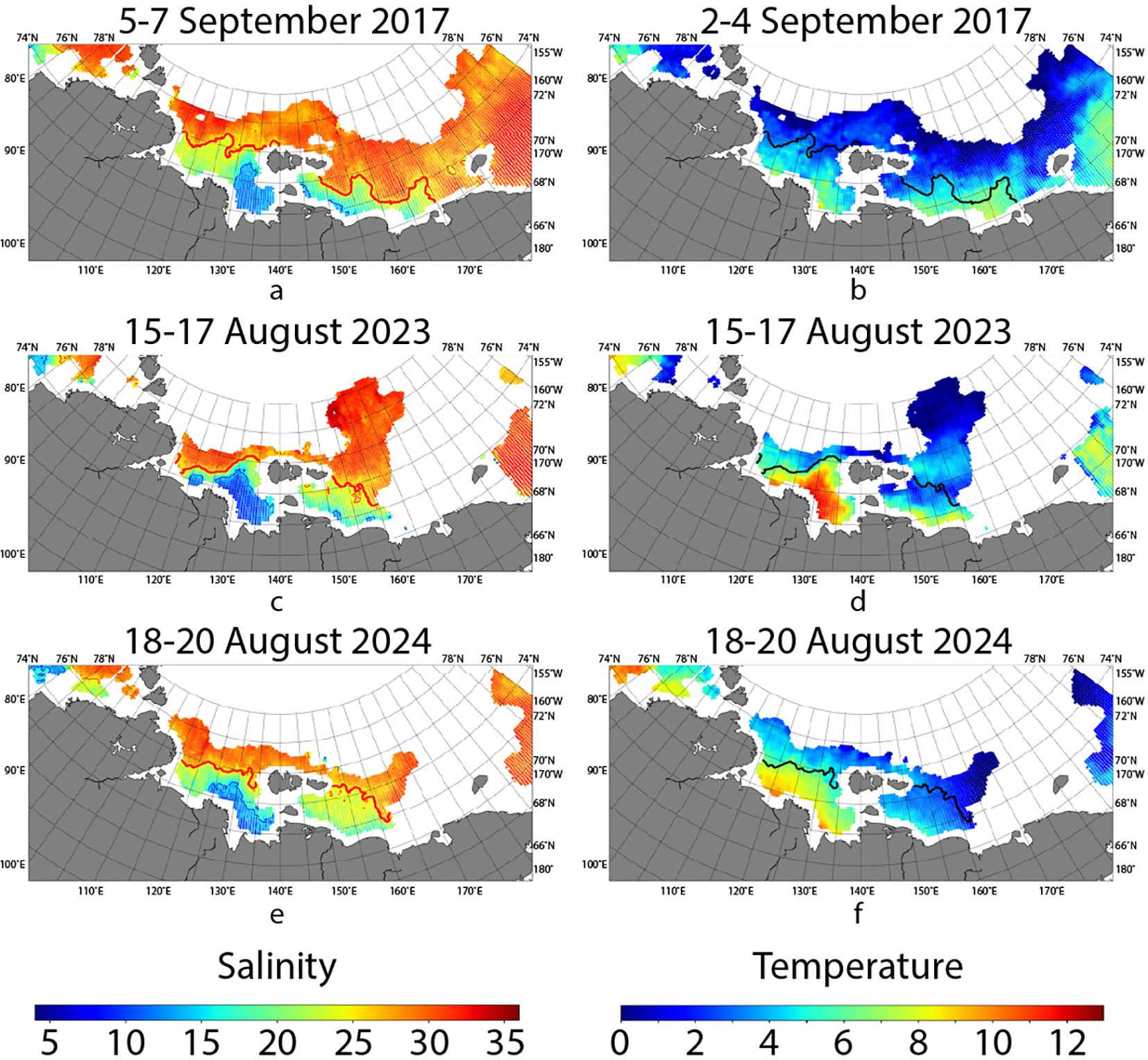 Figure 12. SSS (left) and SST (right) in the Laptev and East Siberian seas on 5–7 September 2017 (a, b), 15–17 August 2023 (c, d), and 18–20 August 2024 (e, f). The blue and red isolines on SSS panels correspond to the 15 and 25 psu values, respectively. Black lines show the boundaries of the Lena plume according to SSS data.