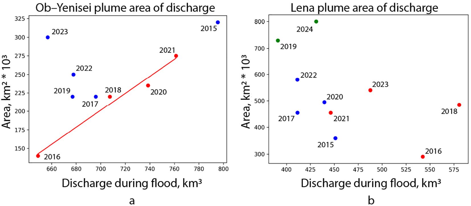 Figure 13. Dependence of area of the Ob–Yenisei plume (a) and the Lena plume (b) on river discharge volume. In panel (a) red dots indicate years with the eastern spreading type, blue dots indicate years with the northwestern spreading type. In panel (b) red dots indicate years with the eastern spreading type, blue dots indicate years with the western spreading type, green dots indicate years with the central spreading type.