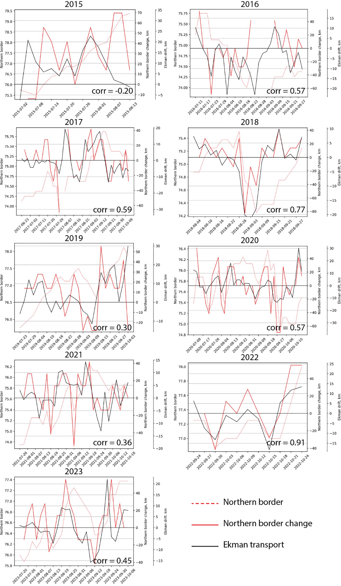 The correlation between changes of the northern boundary of the Ob–Yenisei plume and surface layer transport according to the Ekman theory varies considerably across different years. The highest correlation (0.91) was recorded in 2022, high correlation (0.55–0.80) was also observed in 2016, 2017, 2018, and 2020. In these years, the Ob–Yenisei plume was not spreading far northward from the central part of the Kara Sea during the majority of the ice-free season. It was either pressed to the coast with subsequent eastward movement (2016, 2018, 2020), or propagated westward (2017). In years with the northern spreading type (2015, 2019, 2023), the correlation was the lowest (below 0.5).